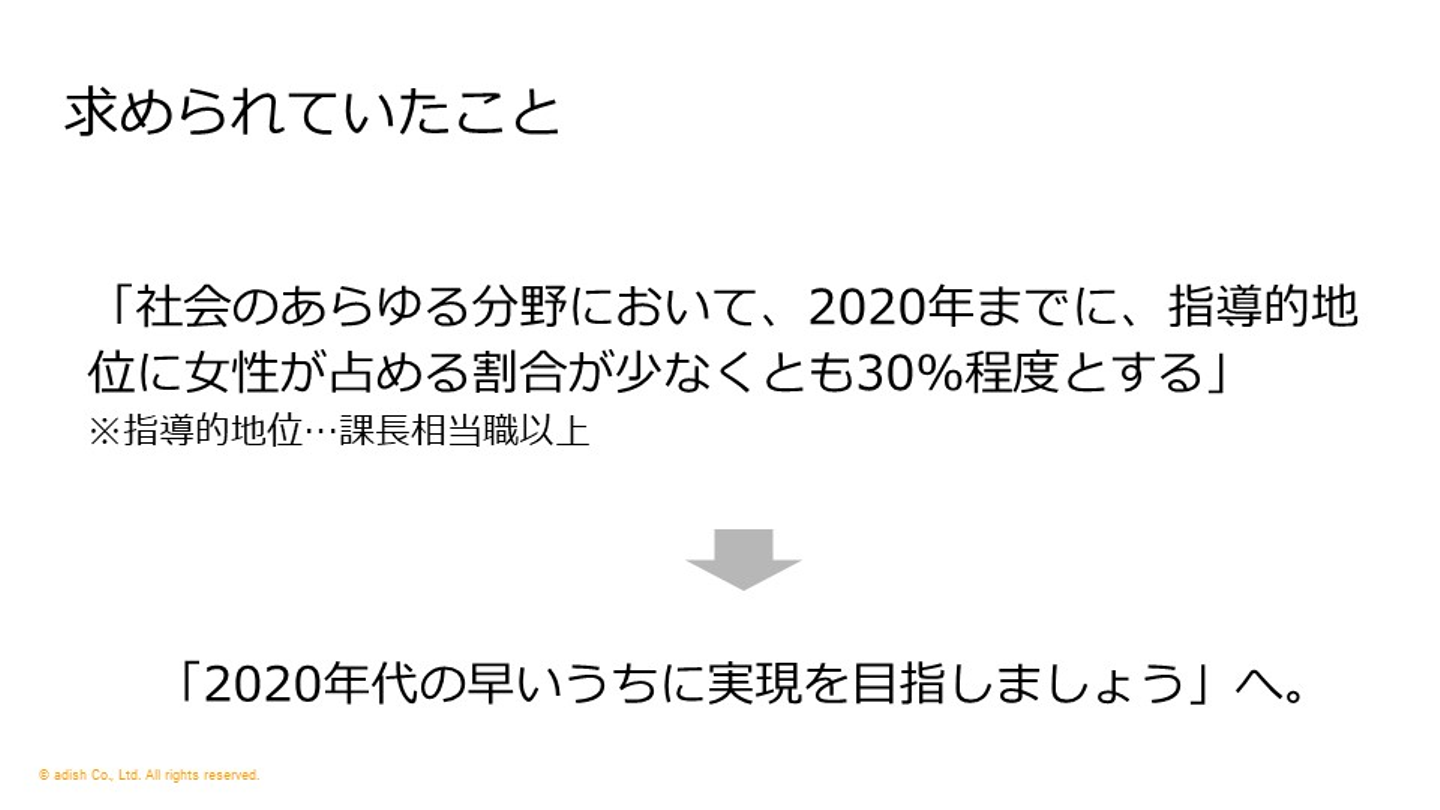 しかし、指導的地位に占める女性の割合については、アディッシュ社員の女性比率61%から期待される割合、あるいは目標30%に対しては遠い。