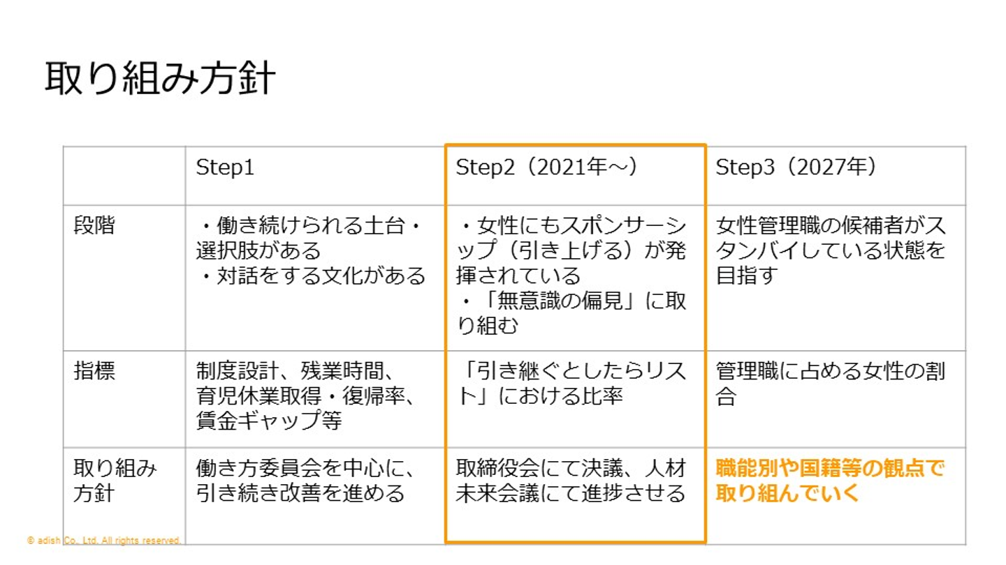 2027年以降のStep3では、女性管理職30%の比率が継続的に担保できるほどに候補者がスタンバイしている状態であり、ここでようやく「管理職に占める女性の割合」という指標が出てくるイメージをしています。その上で、男性の母集団が多い職能別での議論、あるいは国籍等の観点で取り組んでいくことが、アディッシュのグループ経営にとってありたい姿なのではないかと考えています。