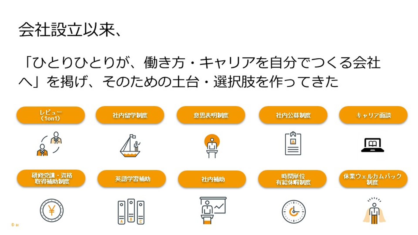 Forbes JAPAN「JAPAN WOMEN AWARD2016」総合ランキング第4位、2018年度ウーマンエンパワー賛同企業アワード「特別賞」といった賞をいただく中で、「女性に特化した制度はありますか?」というインタビューを受けることがありますが、「ありません」と答えています。「ジェンダーやその他切り口に関わらず、働くひとりひとりの人生と向き合うこと」をポリシーとしてきました。