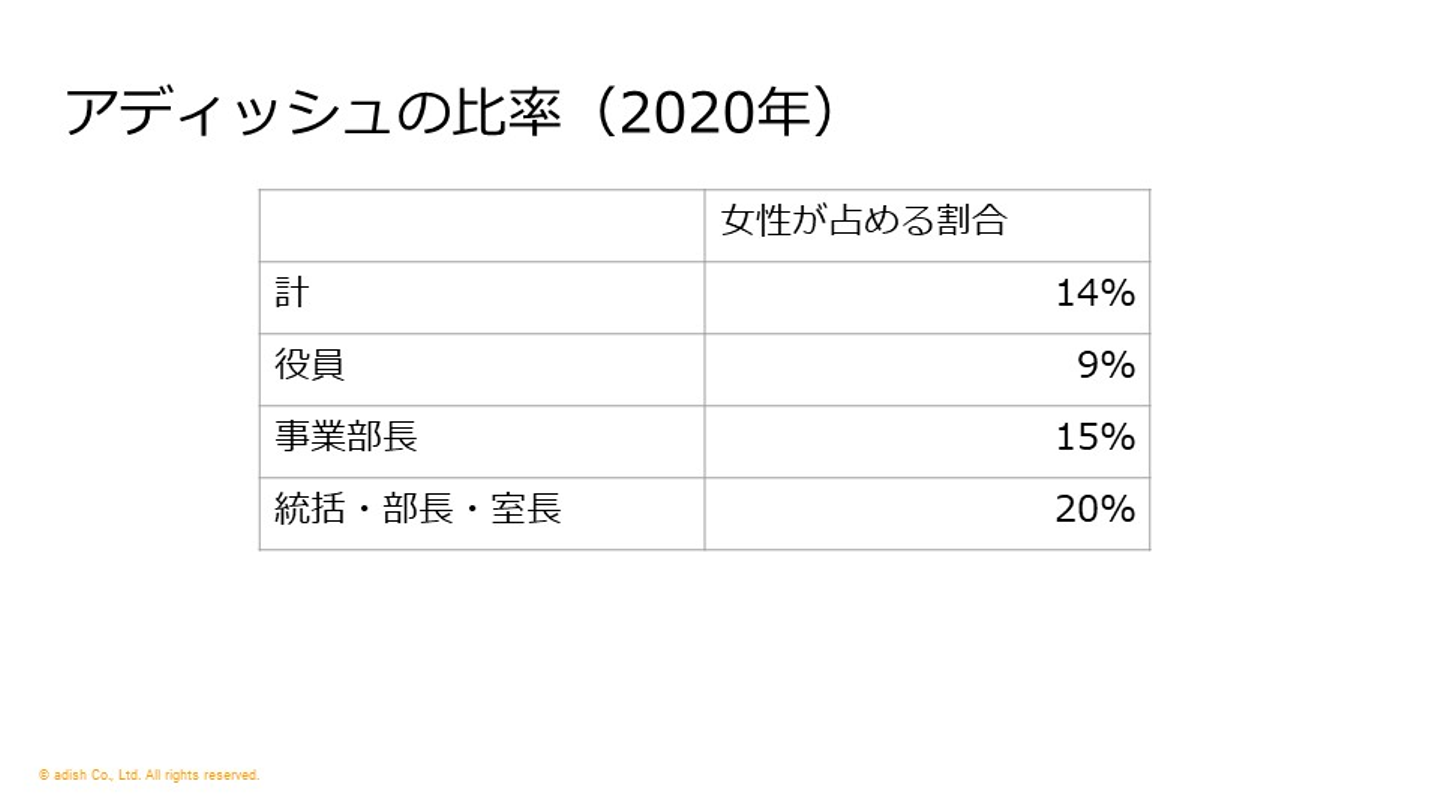 アディッシュでは、職位はロールのひとつにしかすぎないという認識をするようにしていますが、世の中の定義にあてはめて算出すると、指導的地位に占める女性の割合は14%でした。ちなみに、平成30年度雇用均等基本調査によると、課長相当職以上の女性管理職を有する企業の割合は21.7%。女性管理職を有する会社において、管理職に占める女性の割合は11.8%とのことです。