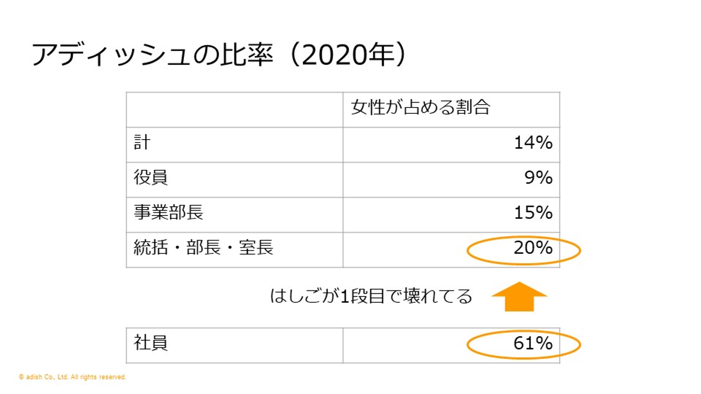 アディッシュは、社員のうち61%を女性が占めていますが、次のロールでは20%に下がります。役員比率がどうこうもありますが、ここですでに比率が壊れています。採用および昇進における格差「壊れたはしご(*1)」の現象が起きているのです。