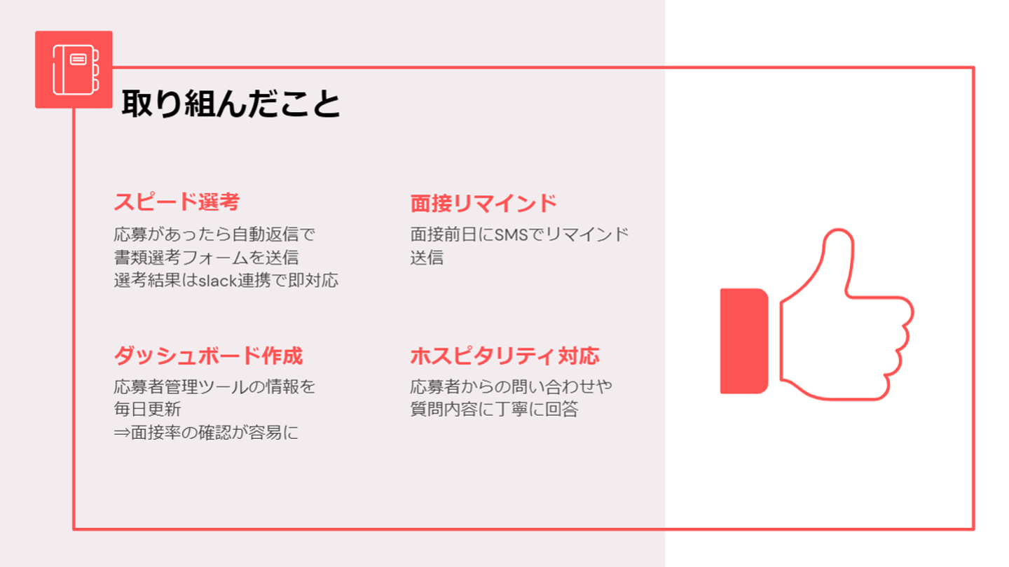 事前ヒアリングは採用の現場と求職者のミスマッチを減らすため、今後も外せない施策となりそうですが、この書類選考率を上げていくためには、より一層きめ細やかなフォローアップ体制を整える必要がありそうです。