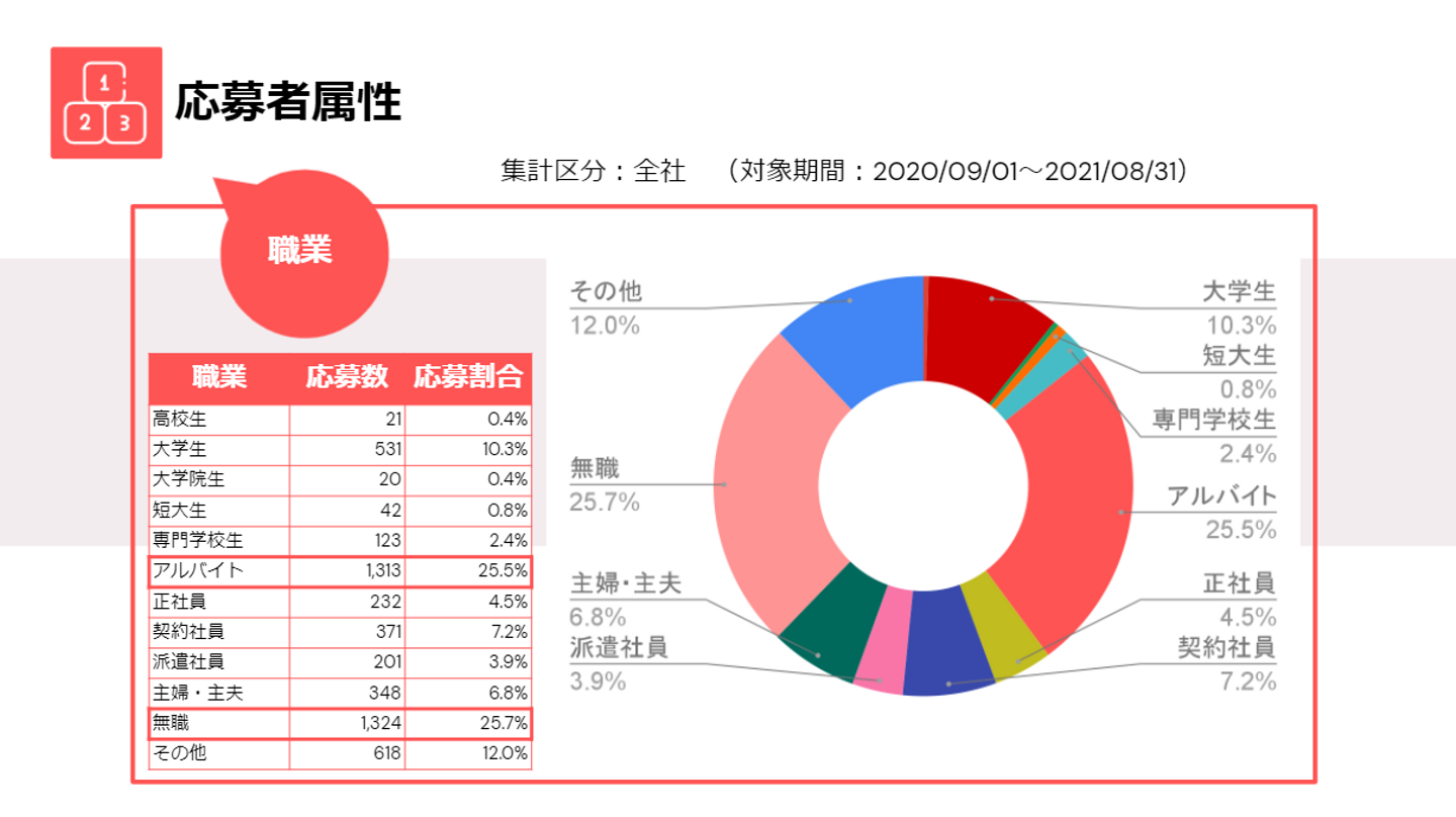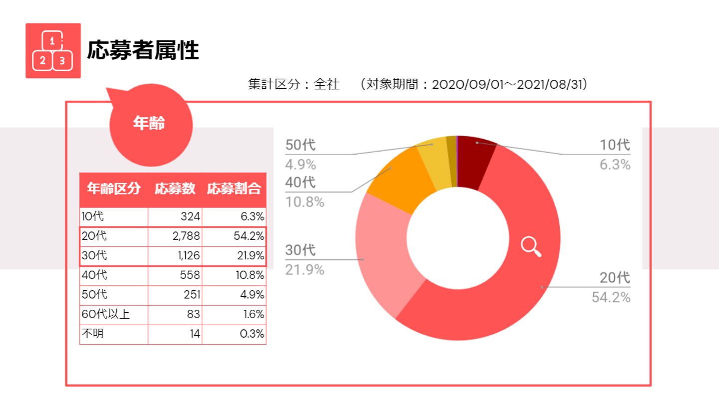 20~30代のフリーター層からの応募が全体の半数以上を占めており、当社の平均年齢とも近い方からの応募が多いことが分かりました。