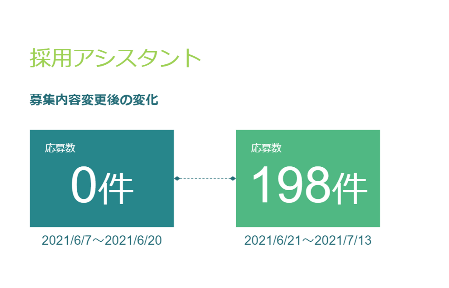 下記は別の資料からの抜粋になりますが、採用アシスタント募集において、募集内容を下記に変えたところ、応募件数が飛躍的に伸びました!