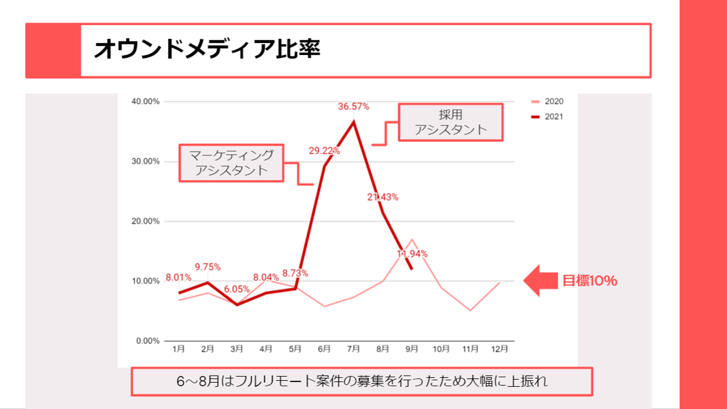 今年は、フルリモート可能な案件募集などで応募が跳ねたこともあり、目標を大幅に上回っていた月も多くありました。