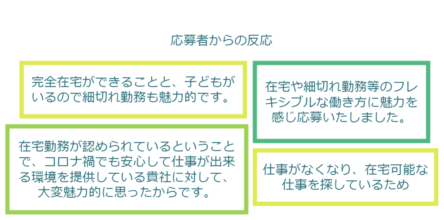 特にこのコロナの状況において「完全在宅」というワードは求職者の目に留まりやすく、いわゆる "人気案件" として採用コストをかけずに採用成功できた好事例となりました。