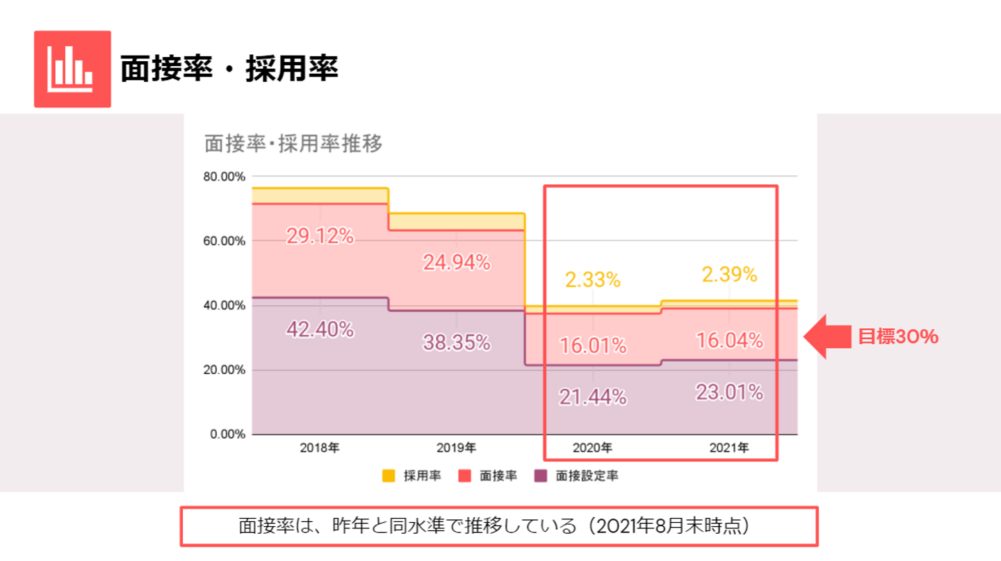 この面接率を上げていかないと、その先の採用率も改善しないということで、2021年は面接率を30%まで向上させることを目標において施策を進めました。