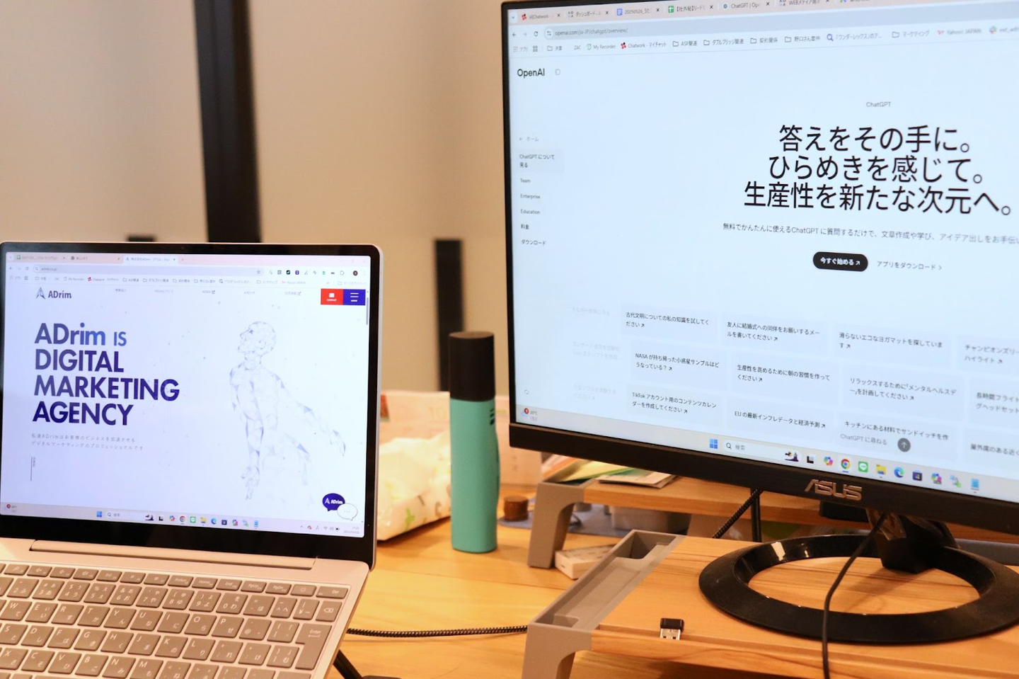 鈴木さんのデスクは、PCスタンドとChatGPTという“二大相棒”が特徴的。