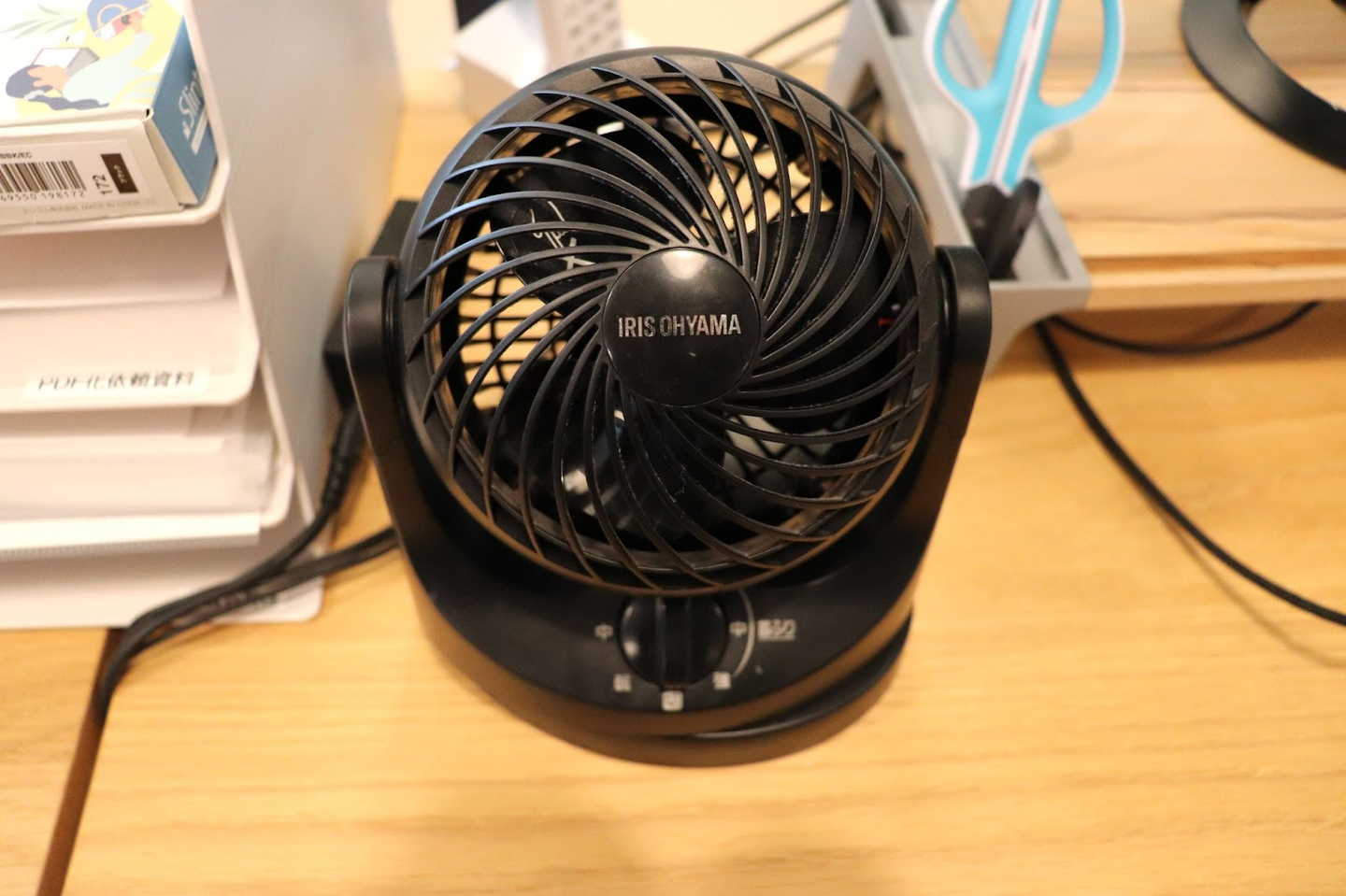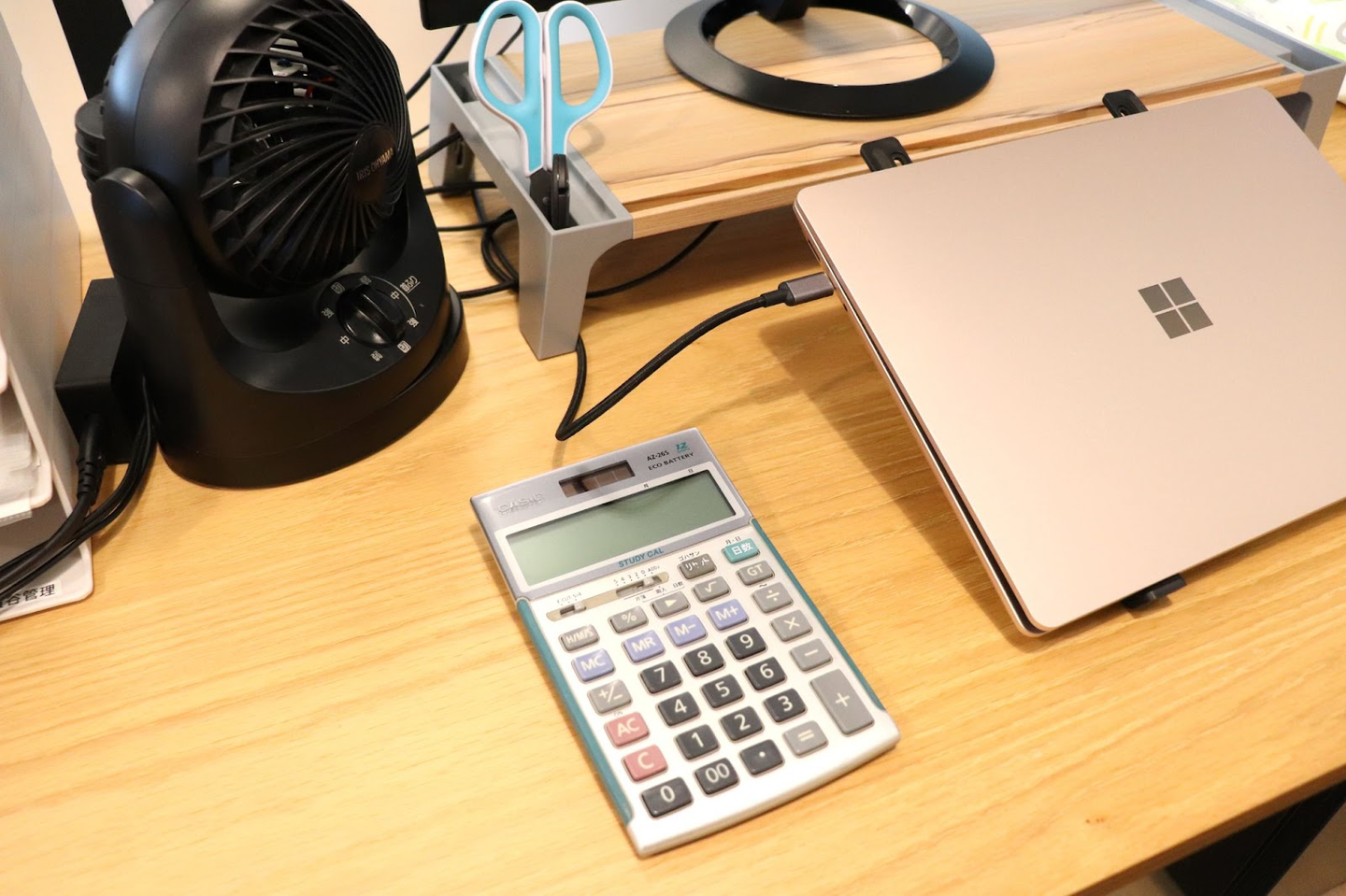手元にある電卓は、まさに“相棒”そのもの。最近は「0」のキーの反応が鈍くなってきたそうですが、それも愛着の証です。PC、テンキー、PCスタンドといった基本ツールに加えて、渡邉さんならではの必須アイテムが「レターオープナー」と「サーキュレーター」🌪️
