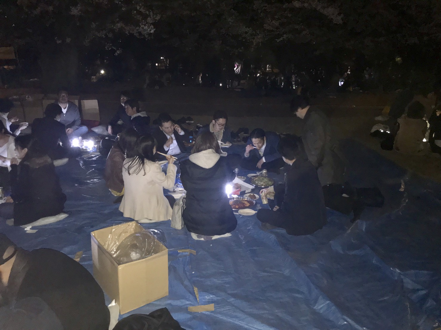 お花見場所の下見はもちろん、場所取り、ブルーシートのレンタル… さらにはクッションやホッカイロ、アウトドアライトまで用意してある素晴らしいセッティングでした!