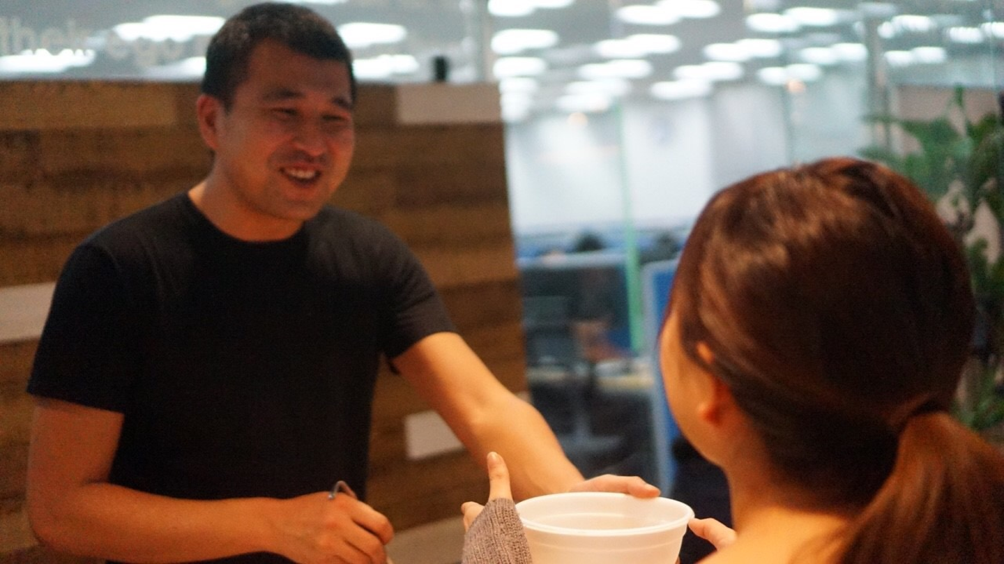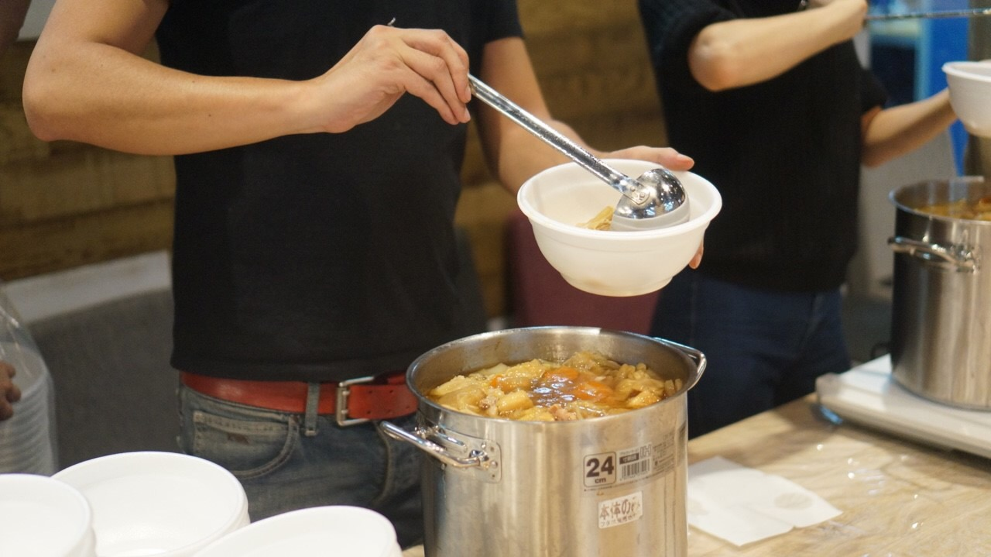 岡村と愛社員課で手際よく社員に配っていきます。何個も鍋を用意しているにも関わらず、早いときは100食分が15分で完売することもあるそうです。