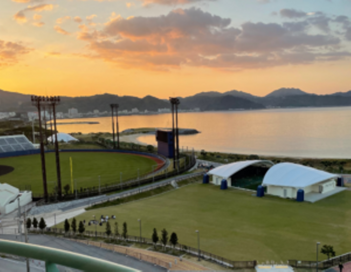 沖縄県でのワーケーション初日は、北海道日本ハムファイターズが直前まで冬季キャンプで利用していた「タピックスタジアム名護」の周りを心地よい気温の中を散歩することから始まりました。