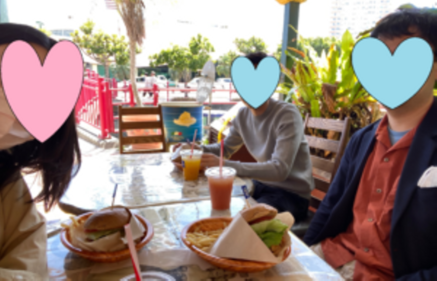 お昼はみんなでアメリカンビレッジ内のハンバーガや