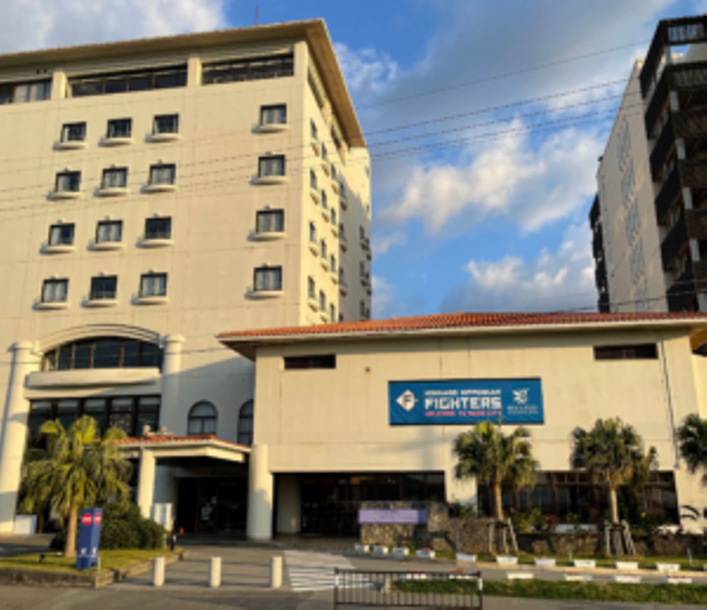 土曜日から日曜日にかけて現地入りしたメンバーで集合しましたが、いつもオンラインで会話しているものの、大半がリアルでは初対面、、、「はじめまして!」の挨拶から始まり、移動中も会話は尽きません。名護市に移動し、北海道日本ハムファイターズが直前まで冬季キャンプで利用していた「ホテルゆがふいんおきなわ」さんにお世話になりました。