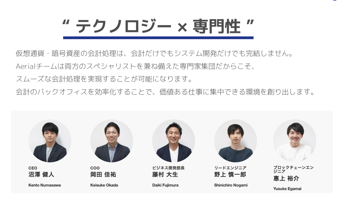 Aerialチームは、ブロックチェーン技術に精通したエンジニアチーム、仮想通貨事業に関するコンサルティング経験豊富な会計士・税理士による会計チームで組成されています。