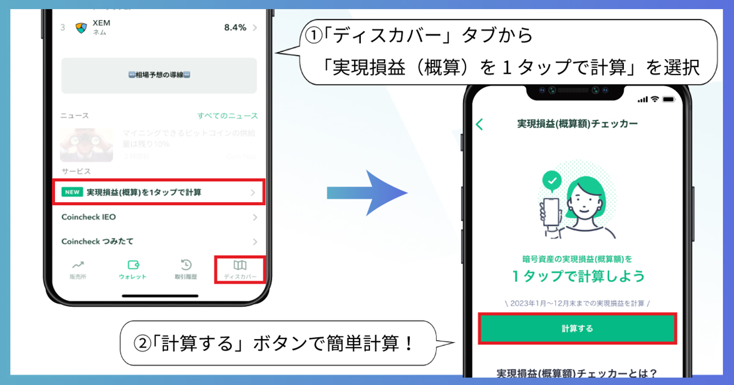 「Coincheckアプリ」内で提供される「実現損益チェッカー」は、対象となる取引履歴に基づき、ワンタップで実現損益の概算額を表示する機能です。詳細は冒頭に記載のプレスリリースをご参照ください。