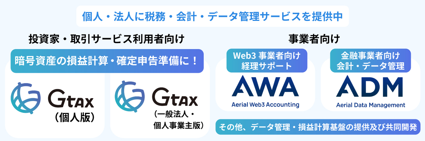 税務(損益計算や確定申告)をサポートする「Gtax」シリーズ、Web3事業者や暗号資産取引所等の金融事業者の会計・データ管理をサポートする「Aerial」シリーズに加え、今回の取り組みのような「データ管理基盤・損益計算基盤」を取引サービス事業者に提供し、共同開発を行うBtoBtoC事業(Gtaxネットワークの構築)など、様々な取り組みを通して「価値革命を実現するインフラを提供する」というビジョンの実現を目指していますので、是非興味を持っていただいた方はお気軽にご連絡ください◎