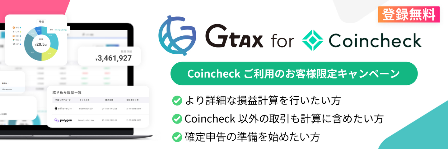 また、機能リリースを記念して、「Coincheck」をご利用のお客様限定のキャンペーン「Gtax for Coincheck」を実施しております。「実現損益チェッカー」機能内からアクセスいただける特設サイトから参加でき、「Gtax」の有料プランをお得にご利用いただけるキャンペーンとなっておりますので、是非この機会にご活用ください。(「Gtax」への登録・少量取引の損益計算は無料です🙆♀️)