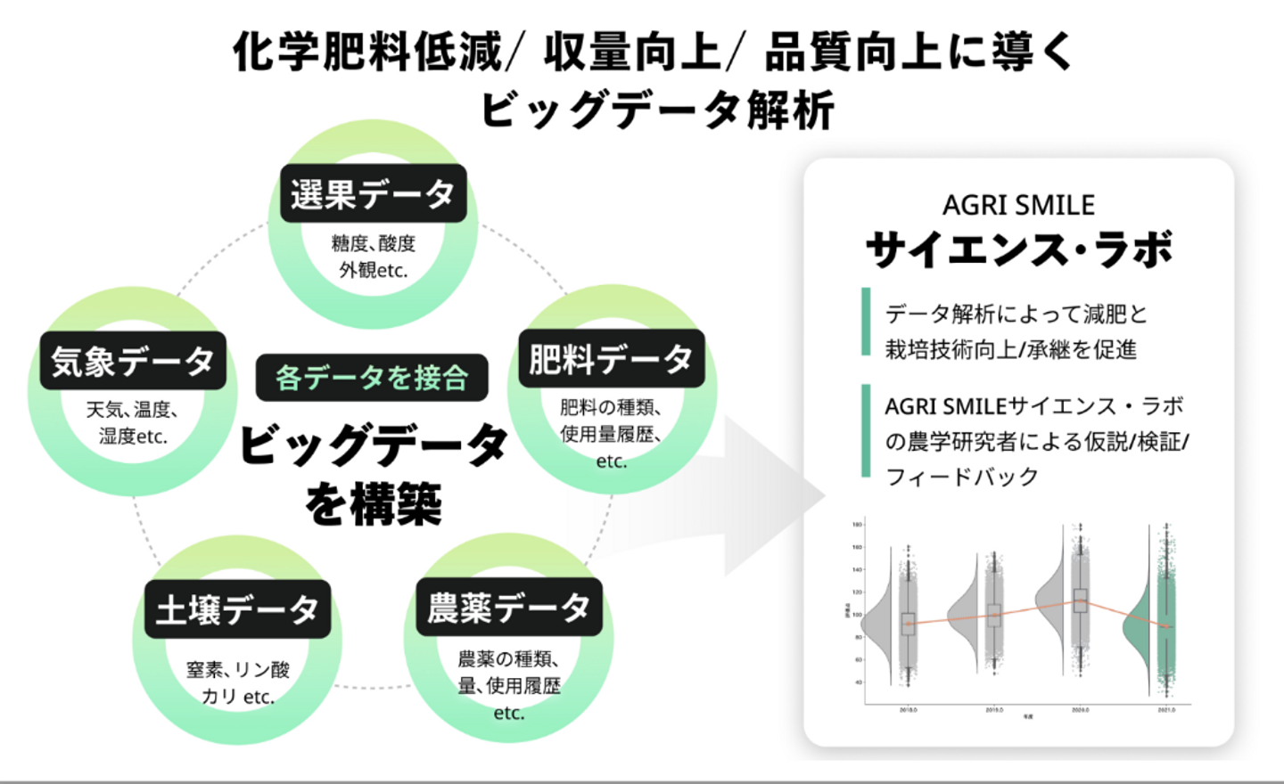内容としては、生産現場から得た活用しきれていない膨大なデータを元に、統計学的なアプローチで解析する。それを現場にフィードバックすることで、より品質の良い農作物を効率的に栽培できる状態に繋げていこうとするものです。