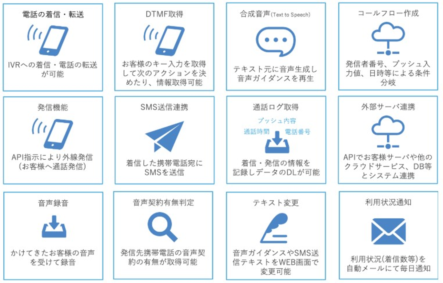 電話の自動応答フローをプログラムするためのシステムなので、音声合成、DTMF取得、コールフロー作成などかなり多彩な機能を持っているのですが、さらにそれに加えて、API指示で電話を発信したり、受電した電話番号に対してSMSを送ったり、さらに外部のシステムと連携する、など高度な付加可能を備えて、柔軟にニーズに合わせた制御を作り込むことができるようになっています。