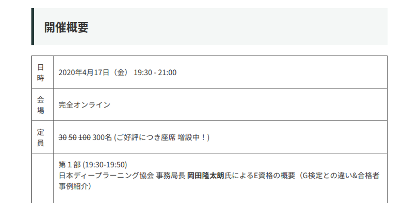 JDLA 共催イベントの集客率は驚異の 1000%超! 日本ディープラーニング協会 (JDLA: Japan Deep Learning Association) は、AI 分野で有名な東京大学の松尾教授が理事長を務める一般社団法人で、ディープラーニング (= 深層学習、機械学習の一種) を中心とする技術による日本の産業競争力の向上を目指すため2017年に設立されました。深層学習の普及のために様々な活動を行っている JDLA の理念は、アイデミーの理念と重なる部分が大きくあります。そこでアイデミーから JDLA に声がけし、2020年4月17日に「AI プロジェクトに成功するためのE資格完全攻略法」と題し イベントの共同開催 を実現したのでした!
