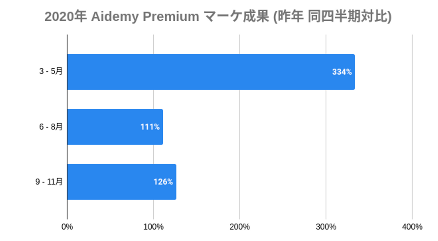 上のグラフからは「2019年3 - 5月に比べ、2020年3 - 5月の成果は3倍以上も大きかった」の他に、もう2つのことも分かります。6 - 8月の成果は 111%、9 - 11月の成果は 126% と、2020年は2019年に比べて大きく成果を伸ばしているという事実です。9ヶ月間の平均を取ると、2019年に比べて2020年は168%もの成果を挙げ、猛烈な成長を達成した年となりました!