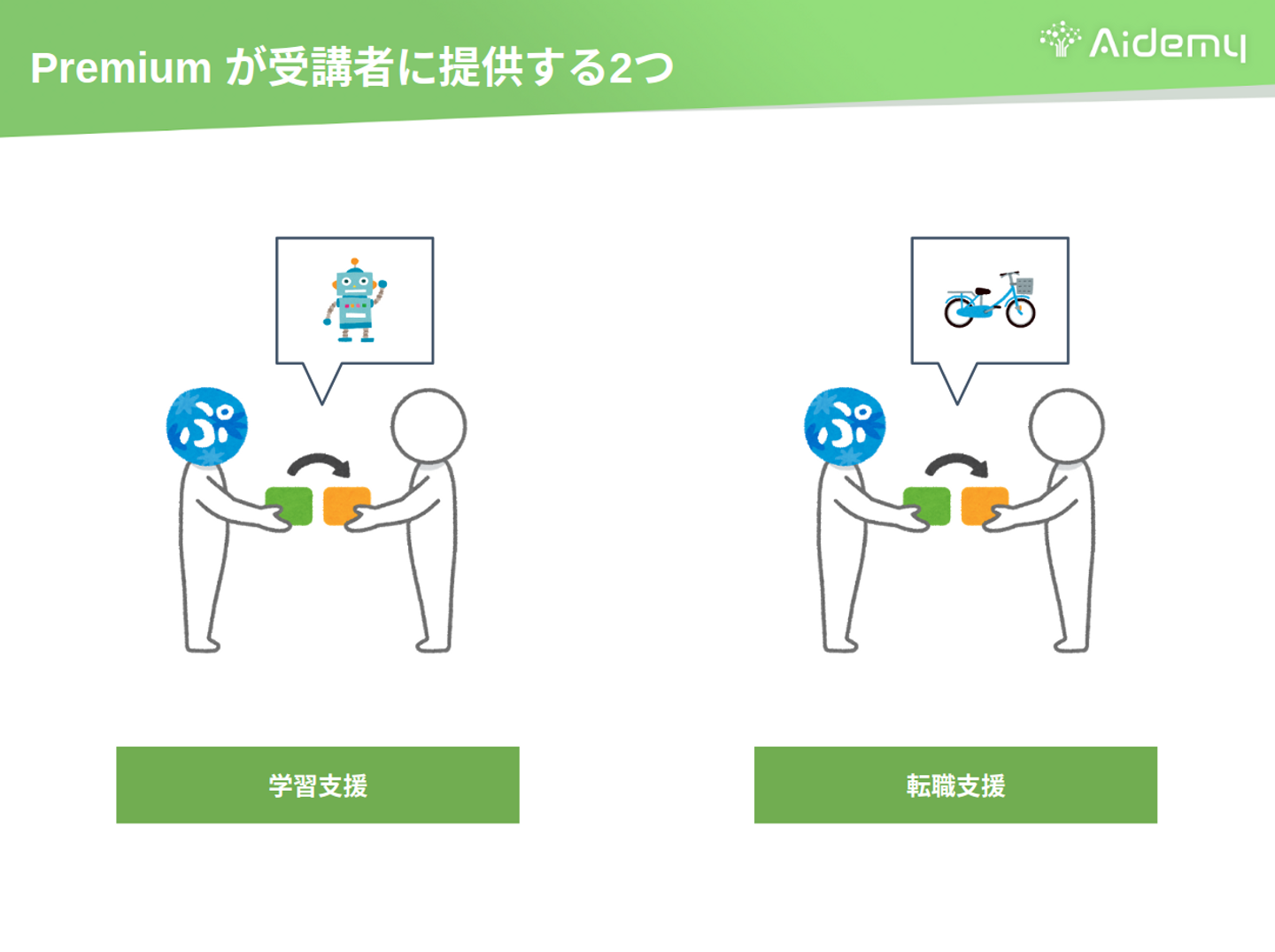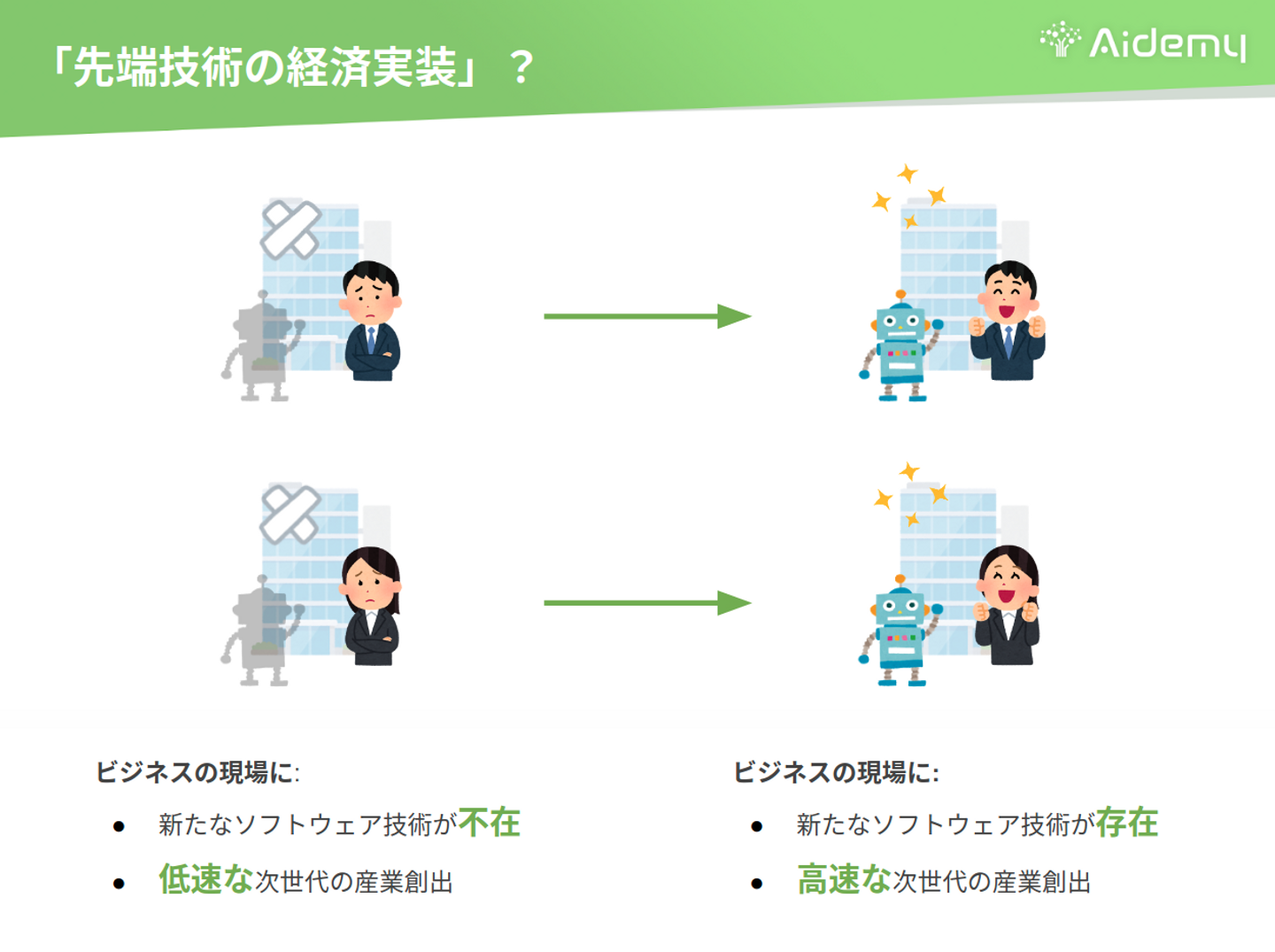 アイデミーのMissionは先端技術をビジネスの現場に経済実装することです。私達が大切にしているのは、「ユーザーを教育・研修すること」ではなく、「お客様の利益を生む状態にすること」です。基礎研究の先端を突き進む研究機関というより、ビジネスへの実用化でお客様の競争力を高め、次世代の産業創出を加速させる存在でありたいと考えています。