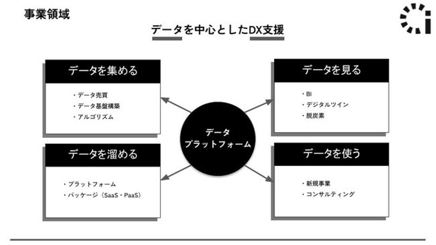 "データプラットフォームを用いてビジネスの価値を最大化・最適化する” をビジョンに掲げ データ・AIを利活用することであらゆるサプライチェーンデータやネットワークを管理し、 DX推進において最も核となる部分をインハウス化することでノウハウの蓄積・ワンストップでの価値提供を実現しております。