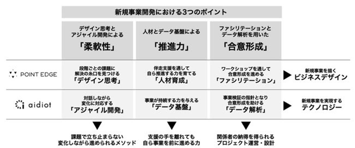 この3つのポイントに対してPOINT EDGEの特徴であるビジネスデザインの手法を使い、「段階ごとの課題に解決の糸口を見つける“デザイン思考”」「伴走支援を通した自ら推進する力を育てる“人材育成”」「ワークショップを通して合意形成を進める“ファシリテーション”」を取り入れ、 アイディオットの特徴である「アジャイル開発」「データ基盤」「データ解析」と結びつけることによって、 新規事業に必要なポイント「柔軟性」「推進力」「合意形成」をさらに強化する狙いがあります。