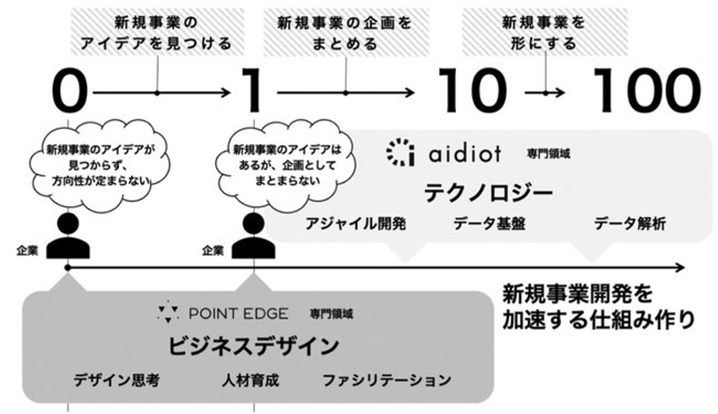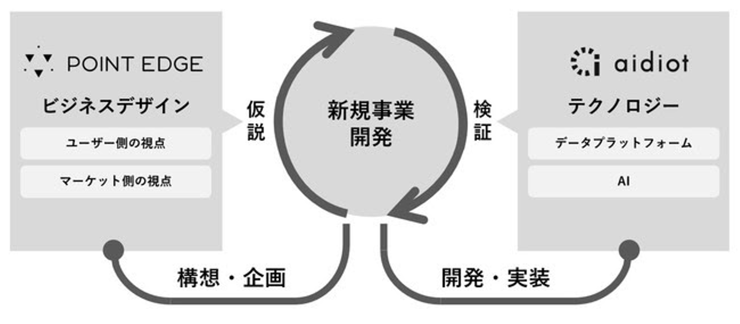 新規事業に対して異なるアプローチを用いてきた二社が連携して支援を行うことで、 企業の新規事業の確実性をこれまで以上に高めることが実現できます。 また開発・実装に強みを持つアイディオットと構想・企画に強みを持つPOINT EDGEという側面もあるため、 新規事業をワンストップで効率的に前に進めることもできます。 こうした二社のシナジーが企業の新規事業を加速させることに貢献できると判断し、 今回の業務提携に至りました。