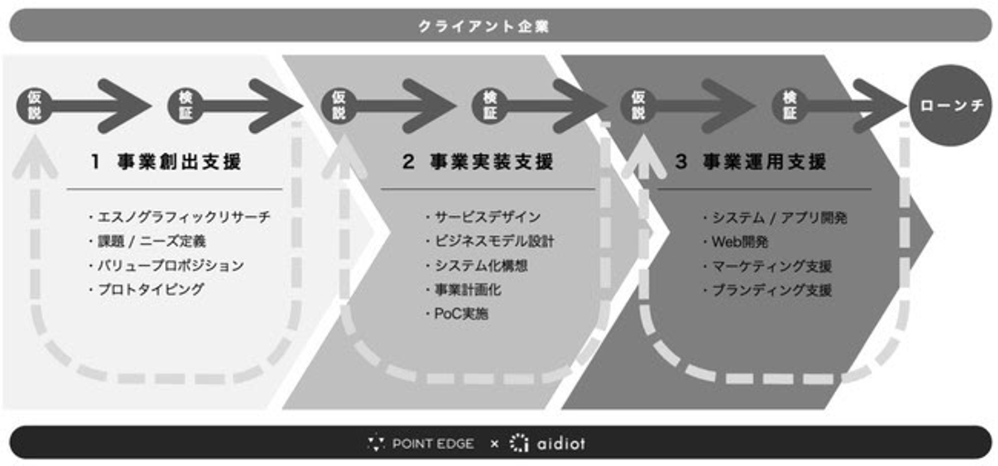 「1.事業創出支援」「2.事業実装支援」「3.事業運用支援」の3段階を通して新規事業の構想から実装を行い、 前半をPOINT EDGE、 後半をアイディオット、 それぞれがメインリードをしますが、 各段階で両社が加わり伴走支援を行いながら、 仮説と検証を繰り返します。