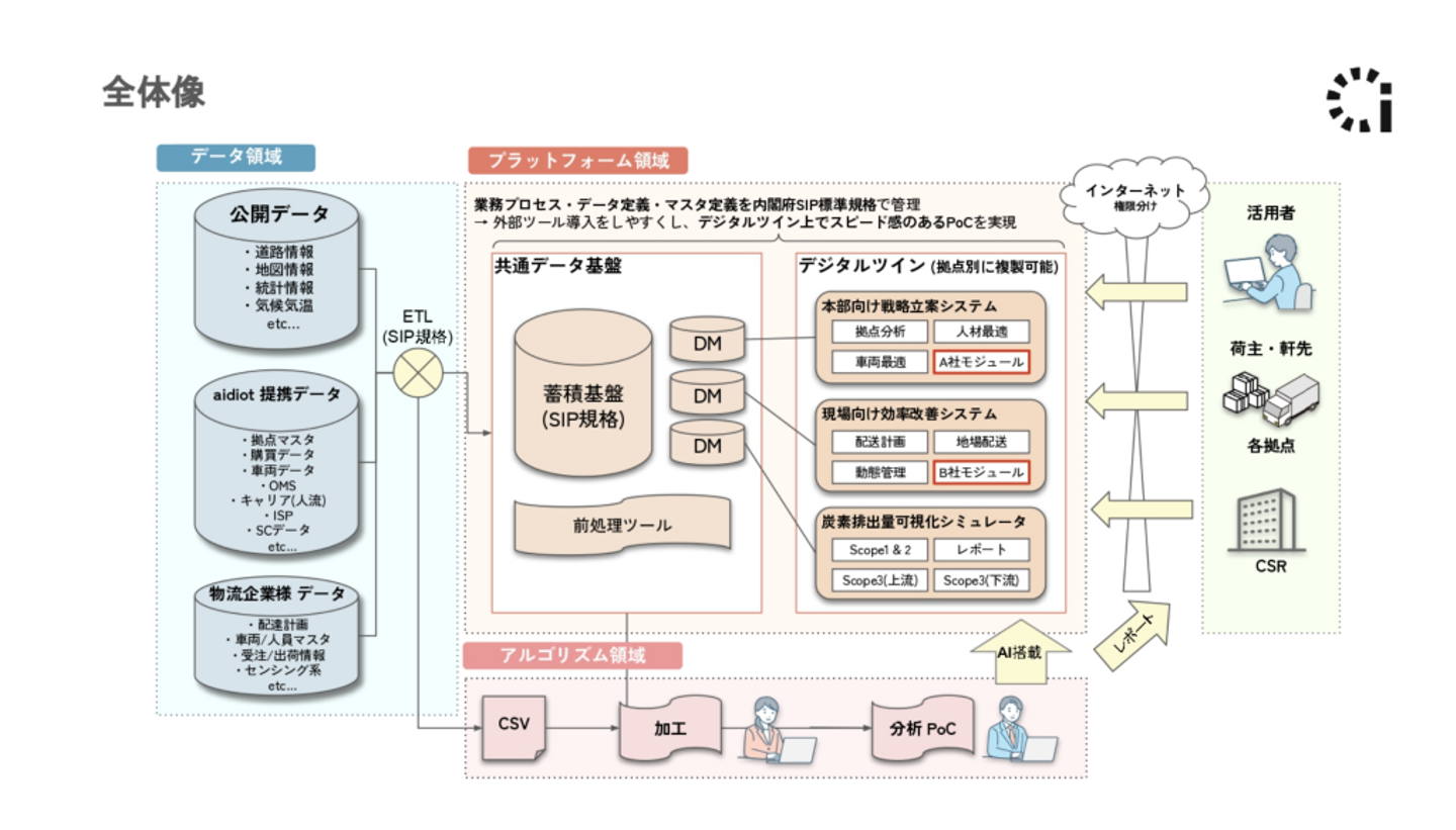 データプラットフォームの提供及びサプライチェーンDXを目的としたデジタルツインを提供する、株式会社アイディオット(本社:東京都渋谷区、 代表取締役:井上 智喜 以下「弊社」)は、AZ-COM丸和グループ(代表:AZ-COM 丸和ホールディングス株式会社、本社:埼玉県吉川市、代表取締役社⻑:和佐見 勝)の次世代流通ビジネスモデル(垂直統合・水平連携)の実現において、内閣府SIPの掲げる物流の標準化に準拠した弊社プロダクトである『ADT(エー・ ディー・ティー)』及び『Sim De Carbon(シム・デ・カーボン)炭素可視化シミュレーター』を活用頂き、物流業界の標準化を図ります。