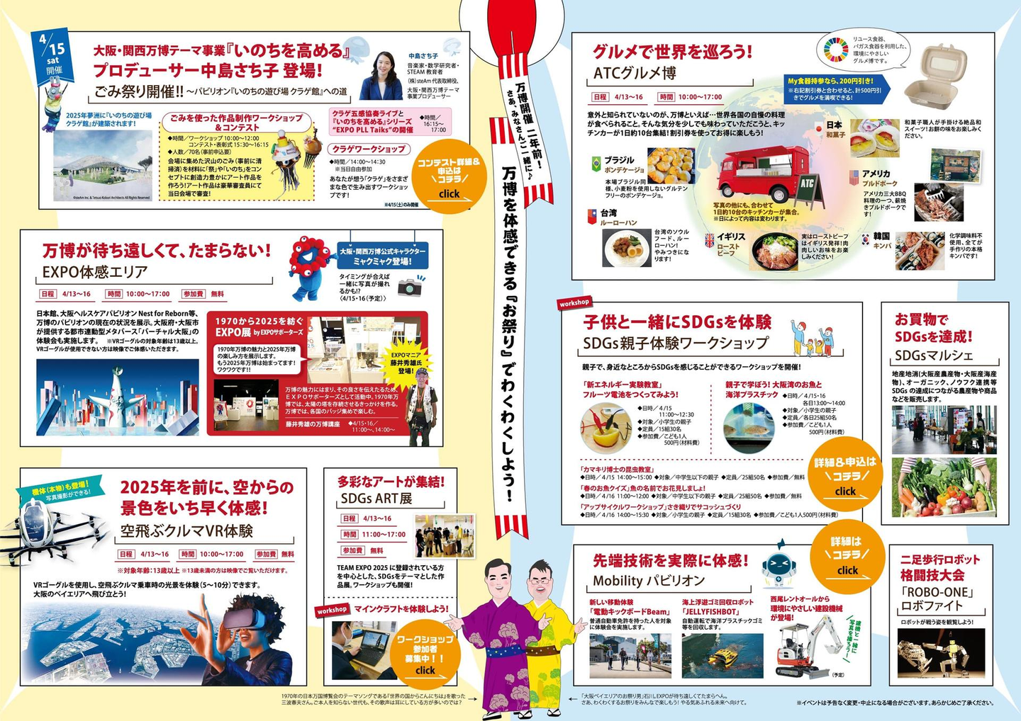 4月13日(木)14日(金) Business Dayの ゲストスピーカー4名による Keynoteの聴講・参加は、 申込が必要です。 (入場無料/お一人様1枚限り/当日は参加者の名刺が2枚必要です) 申込み受付外部サイトが開きます ※ATC OSAKA MIRAI EXPOの開場は10:00。Keynoteの終演時刻は予定です。 他にもイベントもりだくさん! その他の日程も豪華ゲストが登壇予定