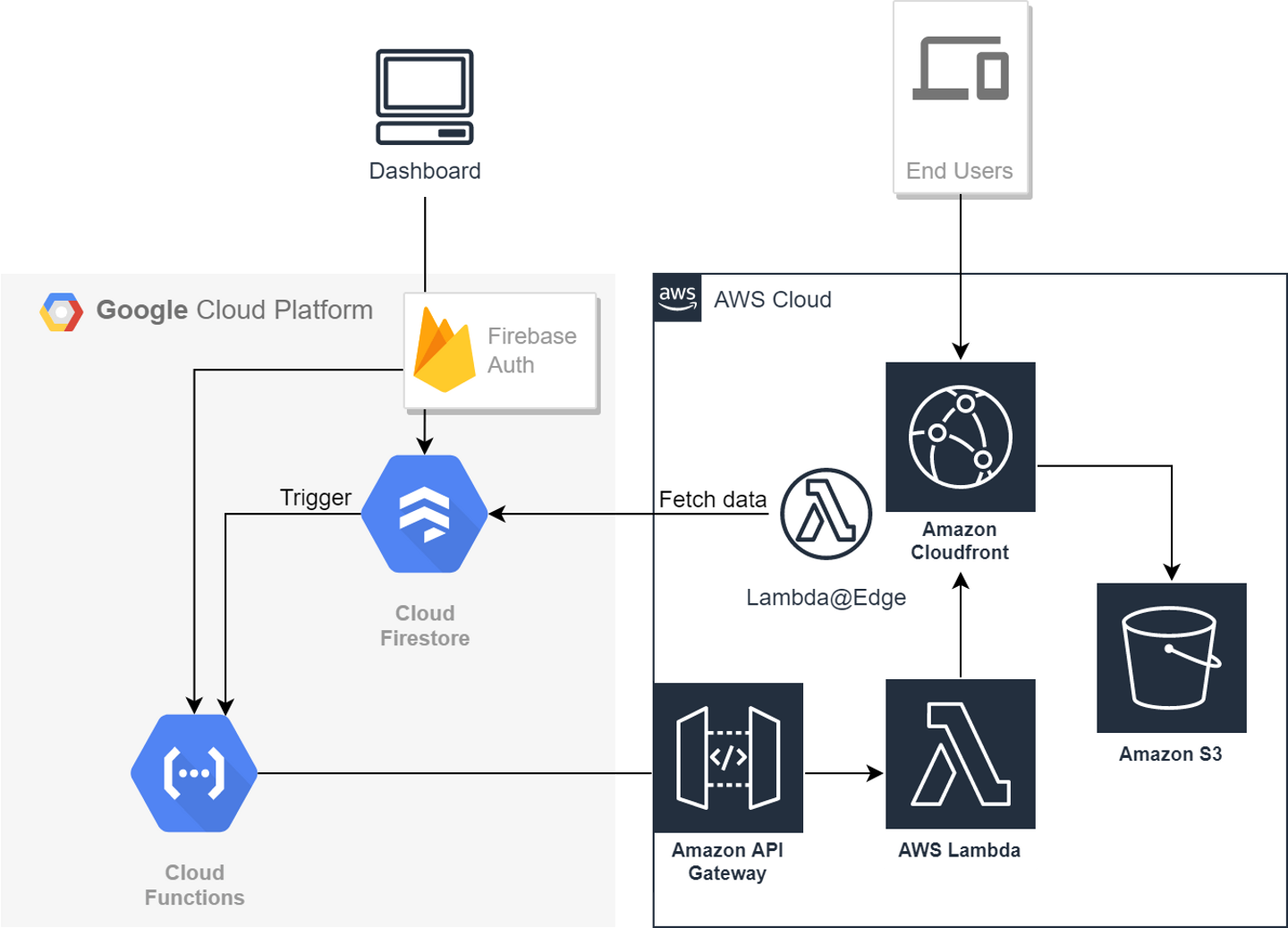 静的なファイルは S3 から、動的なデータは Firestore から。 - Cloudfront に関連する操作(キャッシュクリアや証明書の発行など)は Lambda で記述し、API Gateway を通して公開する。Firebase Functions から必要に応じて呼び出す。(IAM 認証)