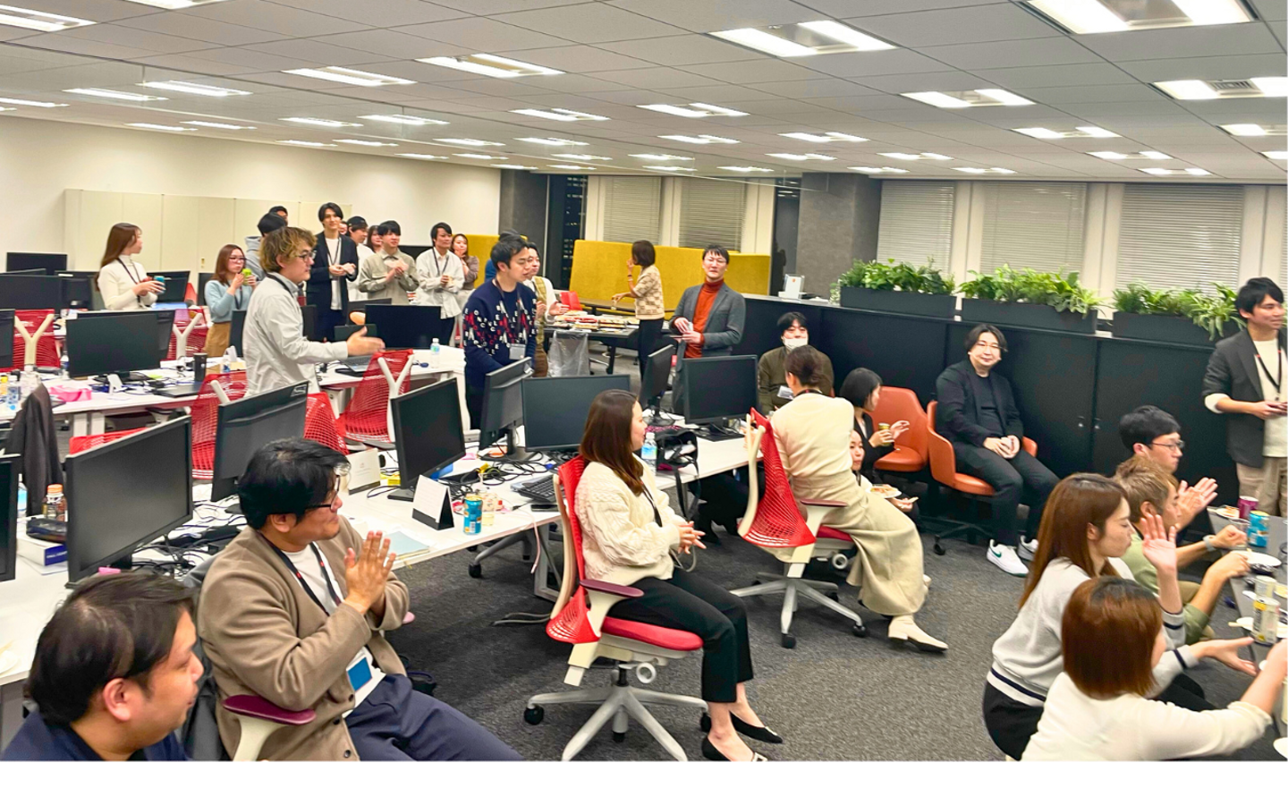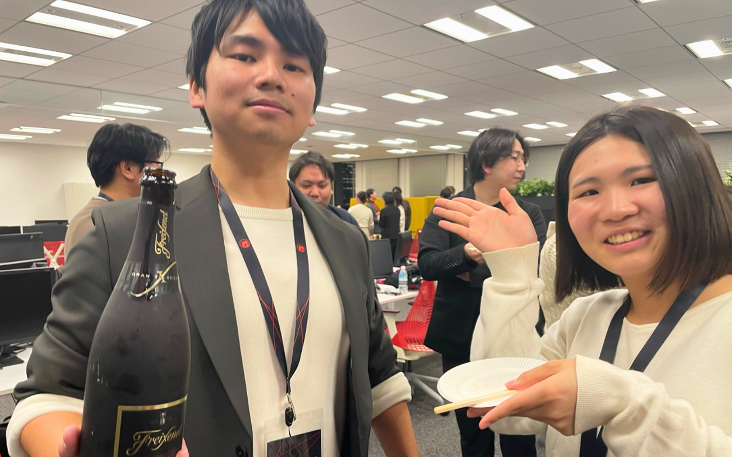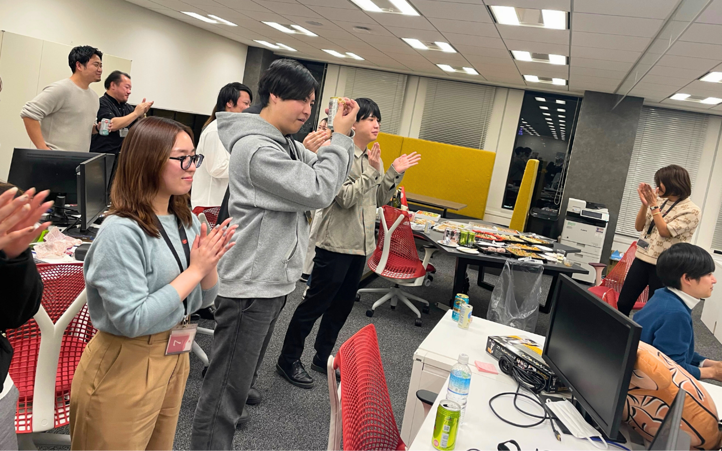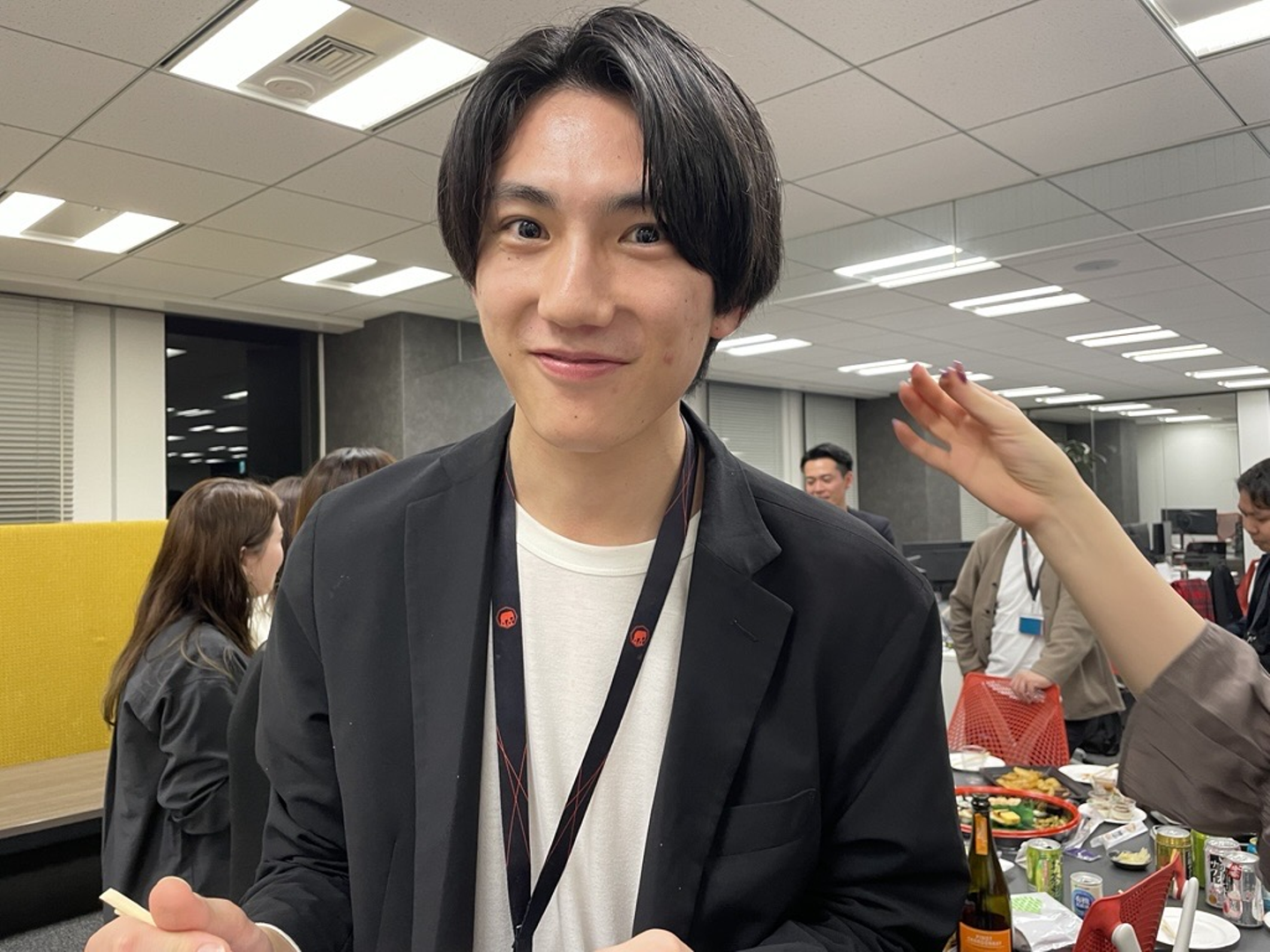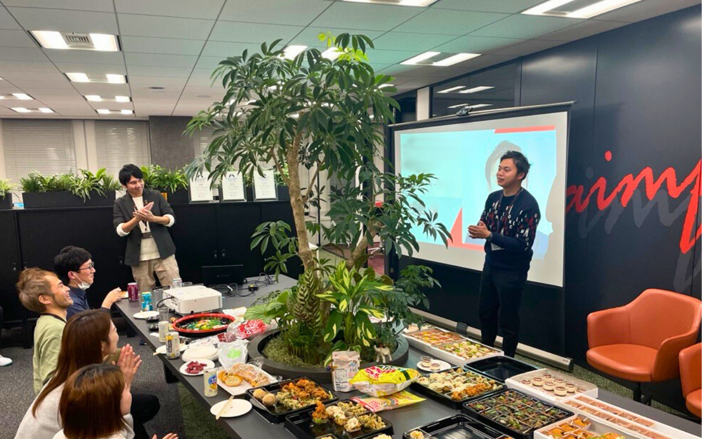 新入社員を代表しての自己紹介&挨拶をしていただきました。新しいメンバーをみんなで温かく迎えます。歓迎でざわつく空気感にオフラインの良さを実感しました。私も入社時に体験しましたが、こういった紹介の場があると、後々「アイムナイトのとき~」といった話題にもつながるんです。
