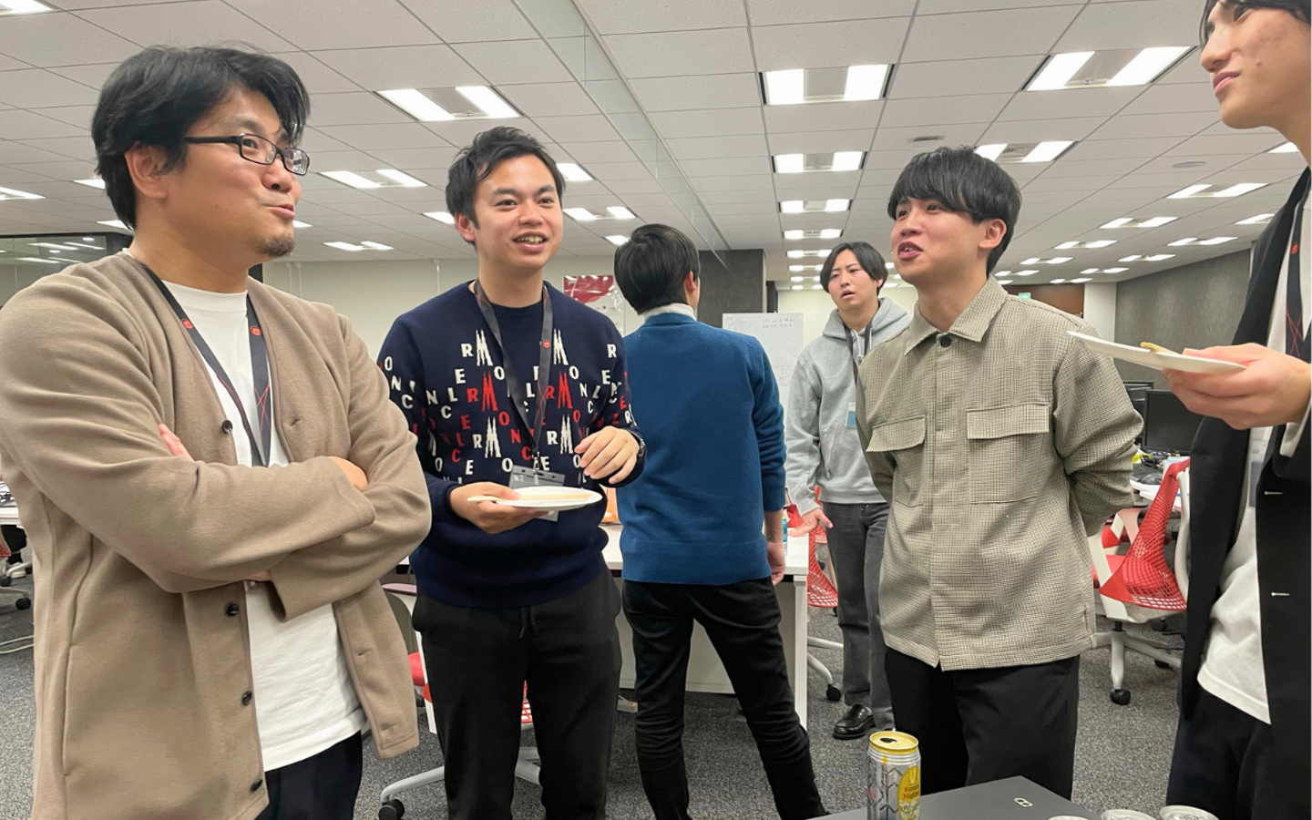 仕事の話もあれば、趣味の話、最近ハマっていることまで、リラックスして話せるのがアイムナイトの魅力。「居心地がいい」「自然と会話が生まれる」 そんな雰囲気が、アイムファクトリーらしさにつながっています。