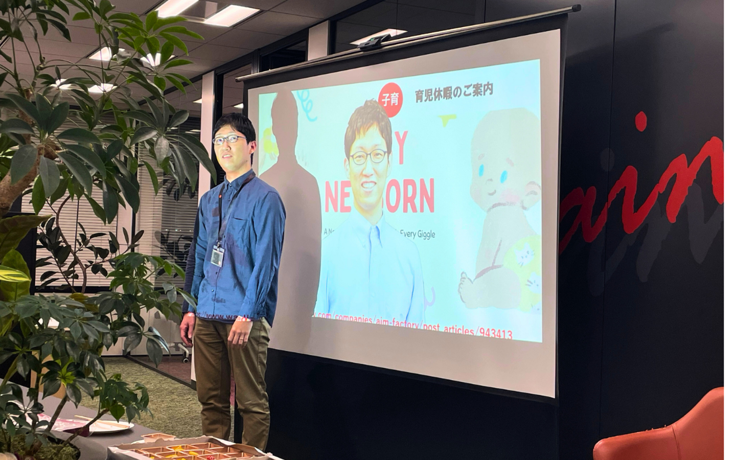 今回は育休に入るメンバーからの挨拶がありました。日本の男性の育休取得率はおよそ3割、育休期間は女性の95%が6か月以上の育休を取得しているのに対し、男性の半分は二週間未満とのこと。