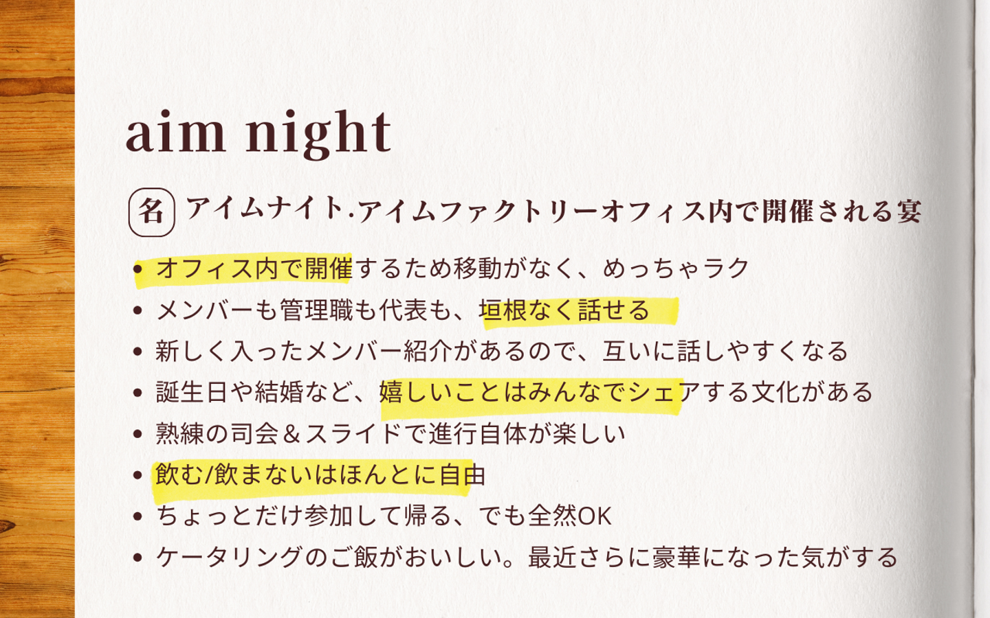 アイムナイトとは、隔月ペースで開催される「宴」のこと。直近で入社した方の紹介や社員のお祝い事(誕生日や結婚等)発表のほか、その時期あったことの共有や、親睦を深めるなどして楽しむ時間となっています。