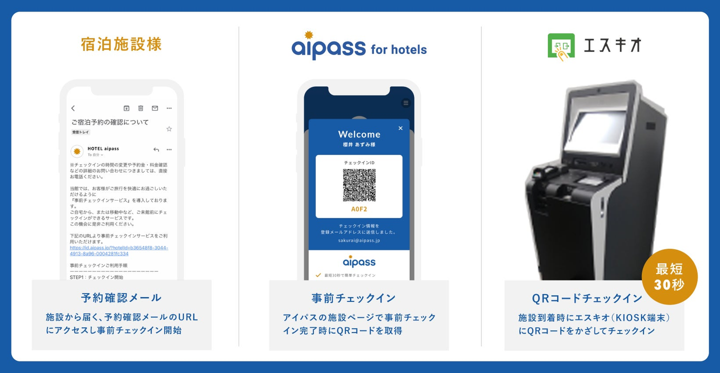 そしてこの度、提供を開始した「キオスク連携プラグイン」では、『aipass for hotels』と国内No.1シェアの自動チェックイン機『Eskio(エスキオ)』が連携し、アイパスで事前チェックインした際に発行されるQRコードを、施設到着時にエスキオにかざすだけで最短30秒でチェックインが完了します。そのことで、フロント業務の効率化はもちろん、快適で安心・安全な宿泊体験を提供することが可能になります。