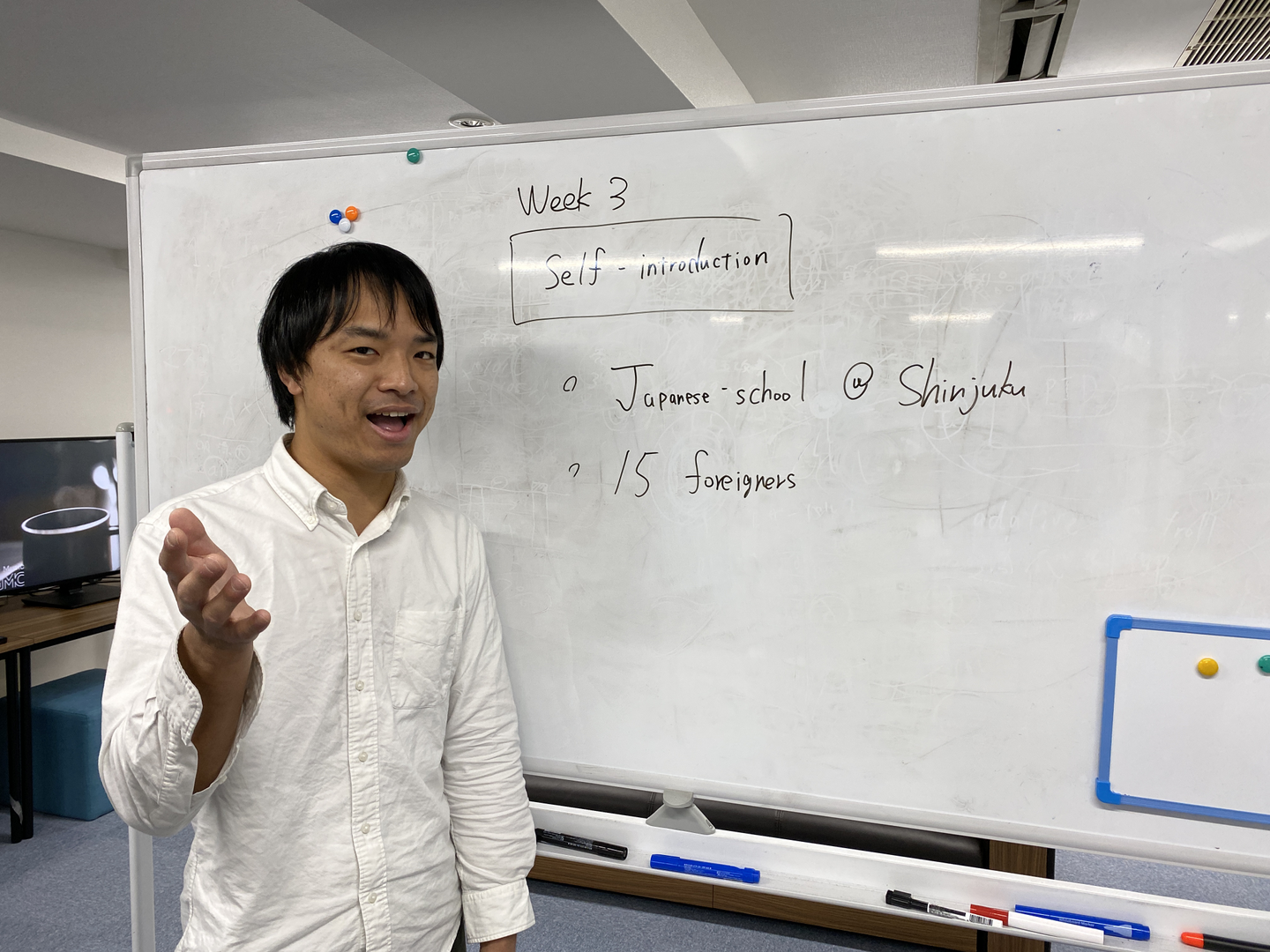 自分が新宿の英会話教室に講師として招かれた場合に、15人の外国人にどのような自己紹介をするか