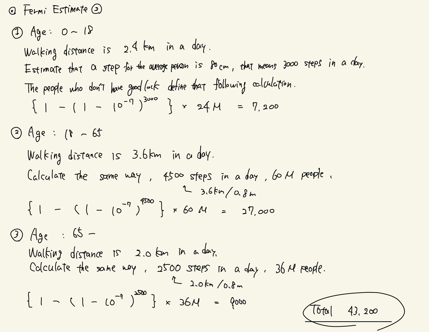 1 ー (1 ー 10 ^ -8) ^ 3,000(歩) × 2,400(万人) = 7,200人