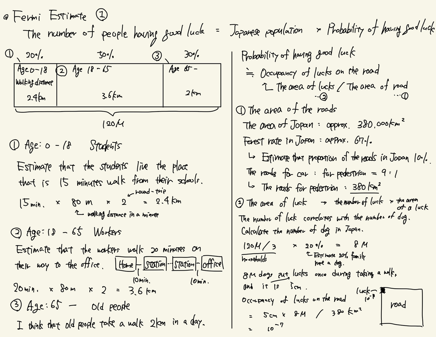 日本の国土面積は約38万km2であるという知識と、国土に占める森林の割合は67%であるという知識から、日本国土に占める道の面積はおおよそ10%だろうと見当をつけた。また、道と言っても車道と歩道があり、その割合は車道:歩道 = 9:1と考えると、歩道は約380km2であると計算することができた。
