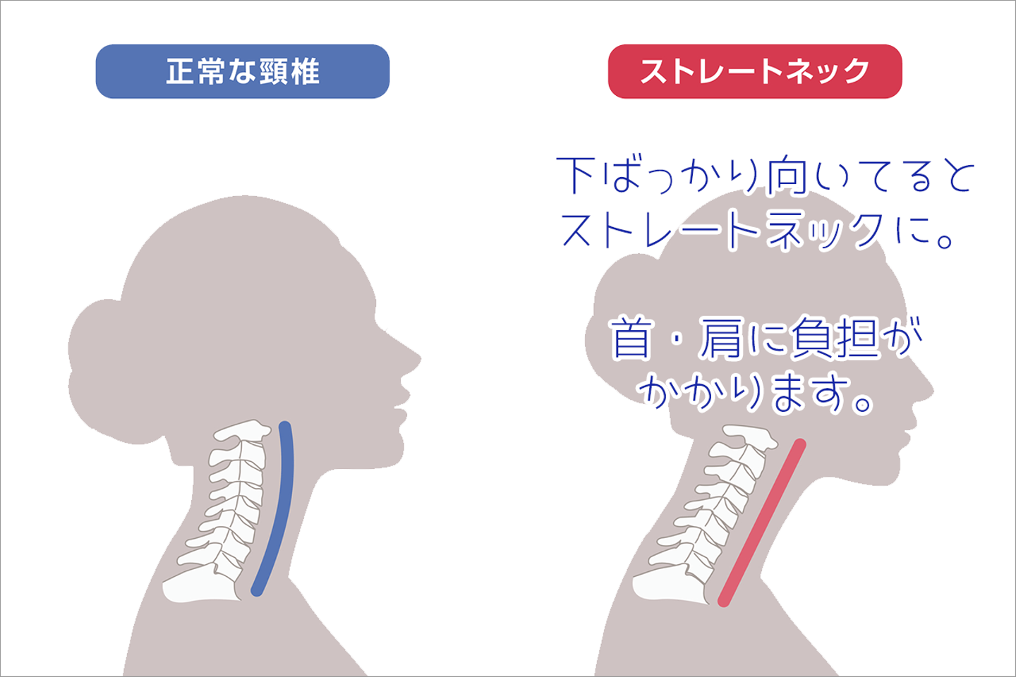 PCやスマホの長時間利用で下ばかり向くことによって、本来は湾曲している首の骨がまっすぐになってしまった状態で、首・肩に余計な負担がかかってしまうんです。