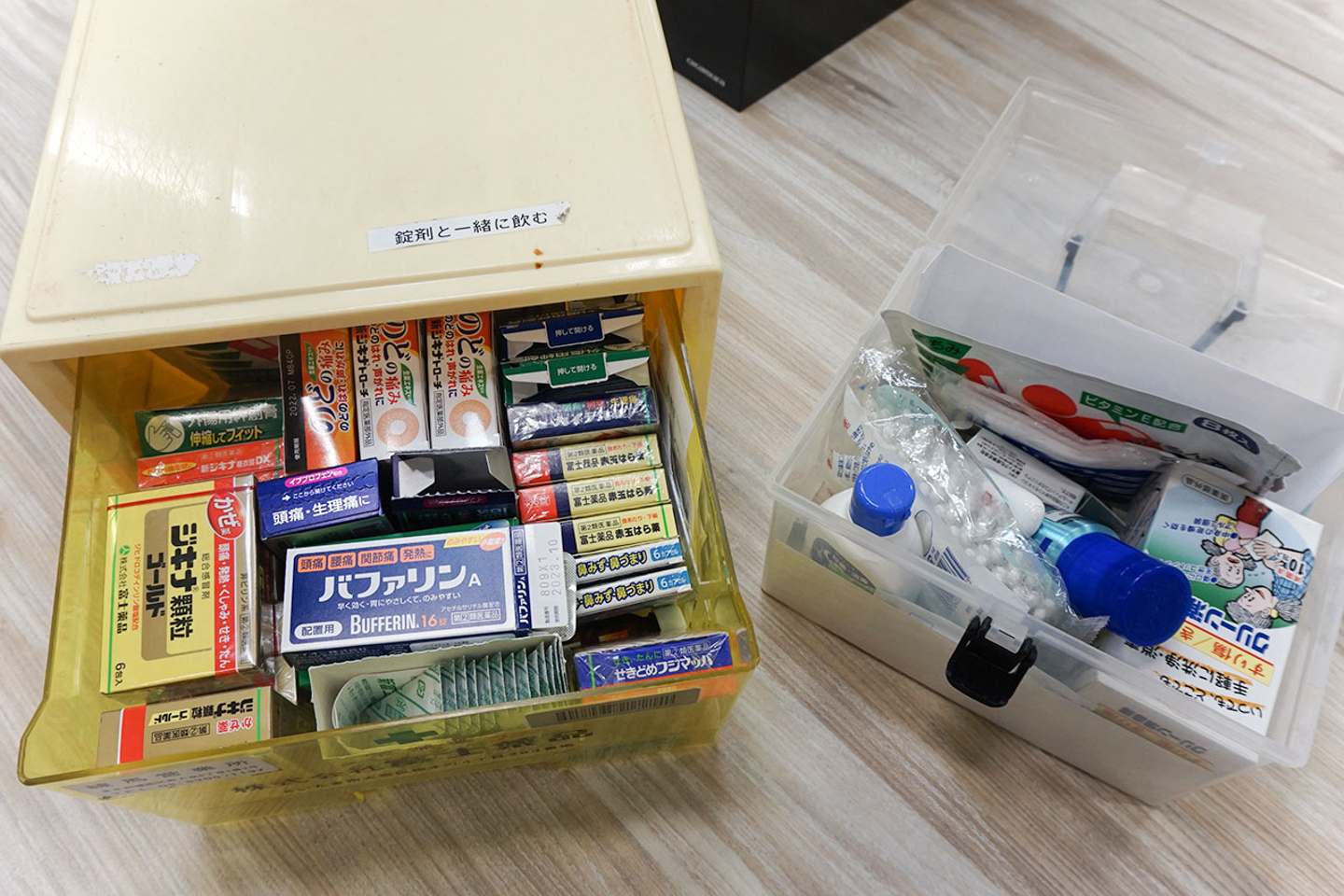 絆創膏、消毒液、シップ、頭痛薬など、大抵の薬は揃ってます。