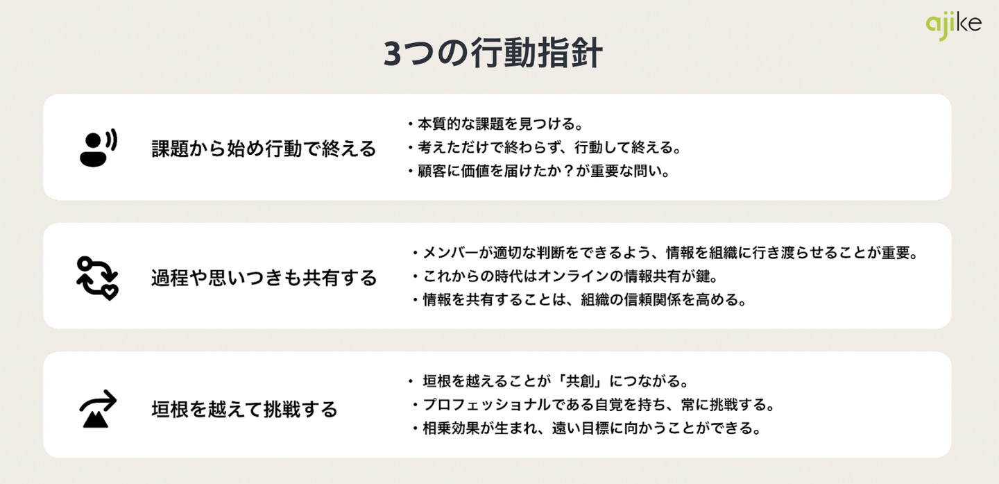 アジケでは"行動指針"をミッション / 目標を実現する行動を明文化したもので、唯一無二のカルチャー作りに欠かせない考え方 = 業務を行う上での行動基準と考えています。