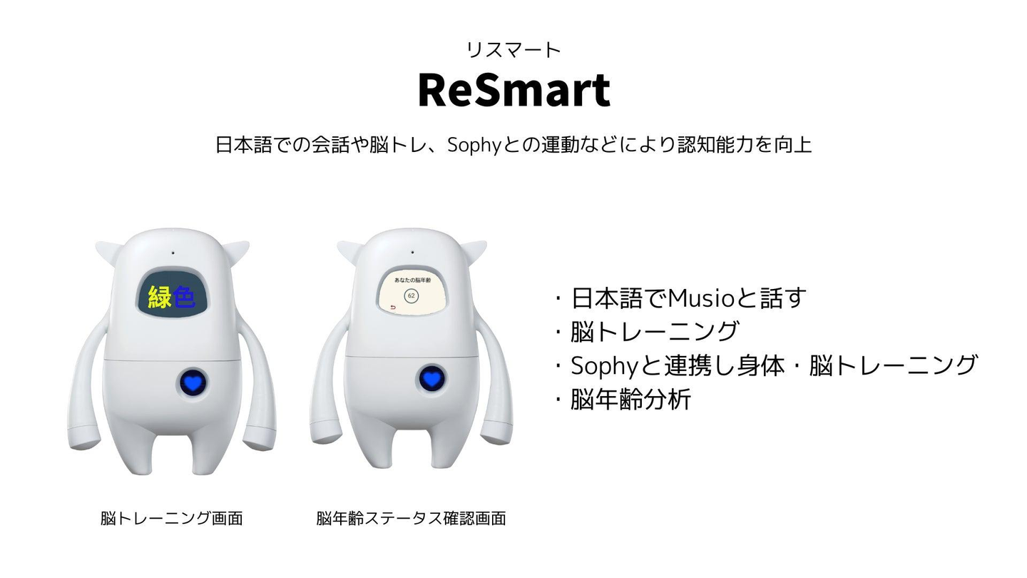- ReSmart(リスマート):脳トレや日本語での会話を通し、学習能力の向上や認知症の予防に貢献