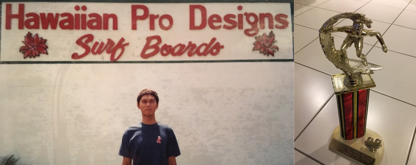 ↑ 左:好きなサーフボードショップの前で 右:カリフォルニア在住日本人大会で4位のトロフィー