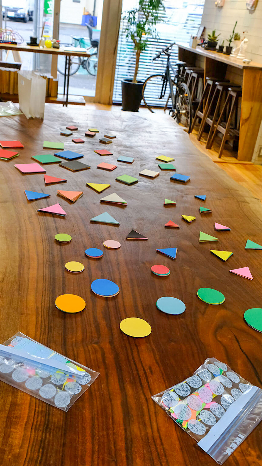 自分の性格や身体的な特徴、どんな人でありたいかなど、様々な要素を思い浮かべてもらい、その要素と関連づけられるカタチや色をした画用紙を1枚選びます。