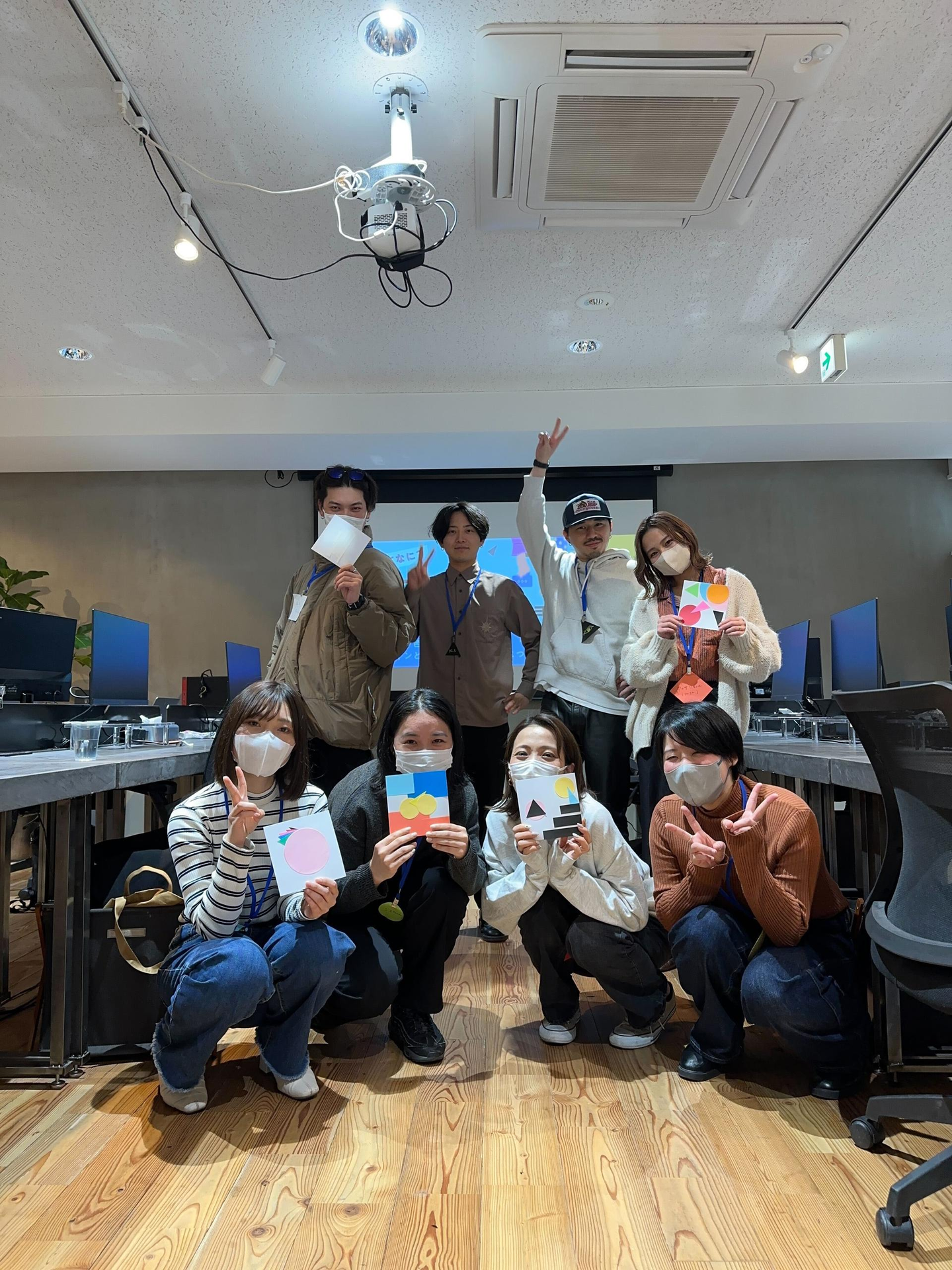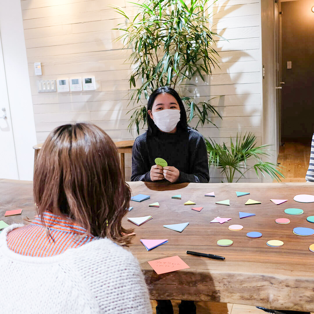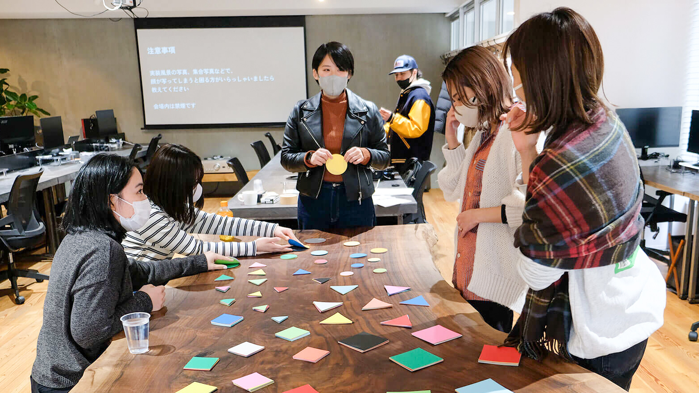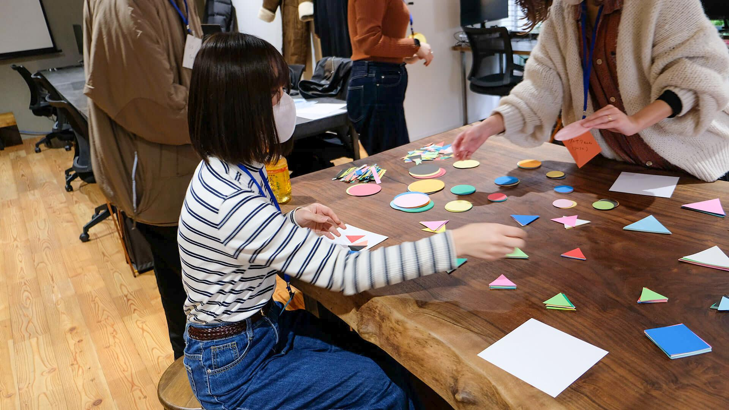 アイスブレイクでは「様々な色の丸・三角・四角の画用紙を1枚選んで自己紹介をする」というワークを行いました。