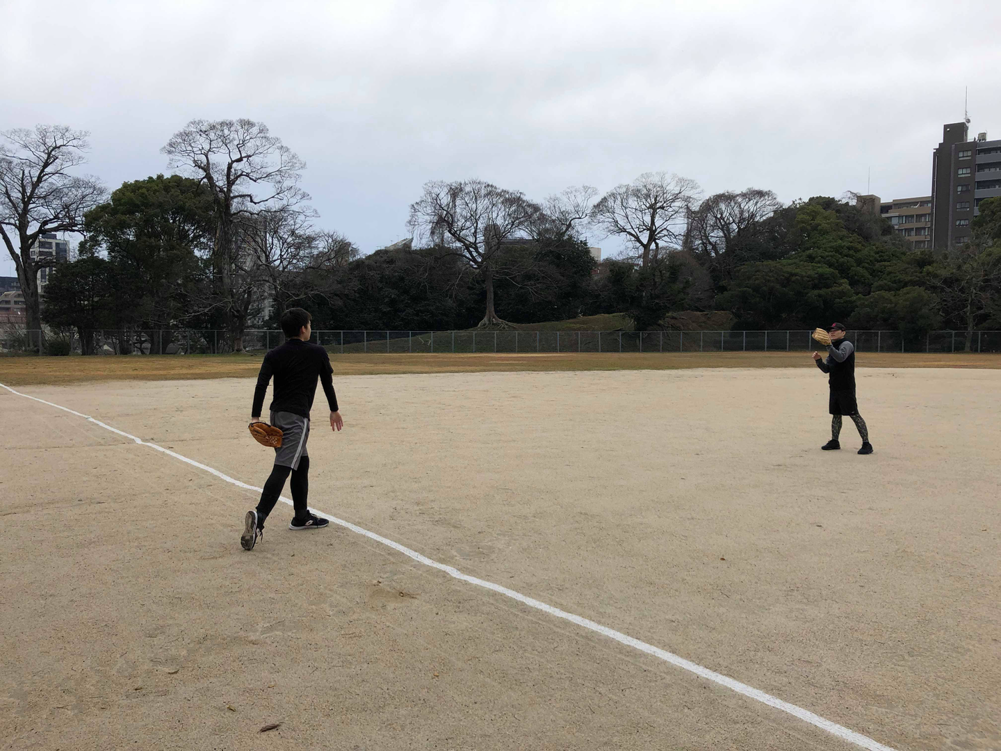 最初は寒くて身体が強張っているので、キャッチボールで温めます。